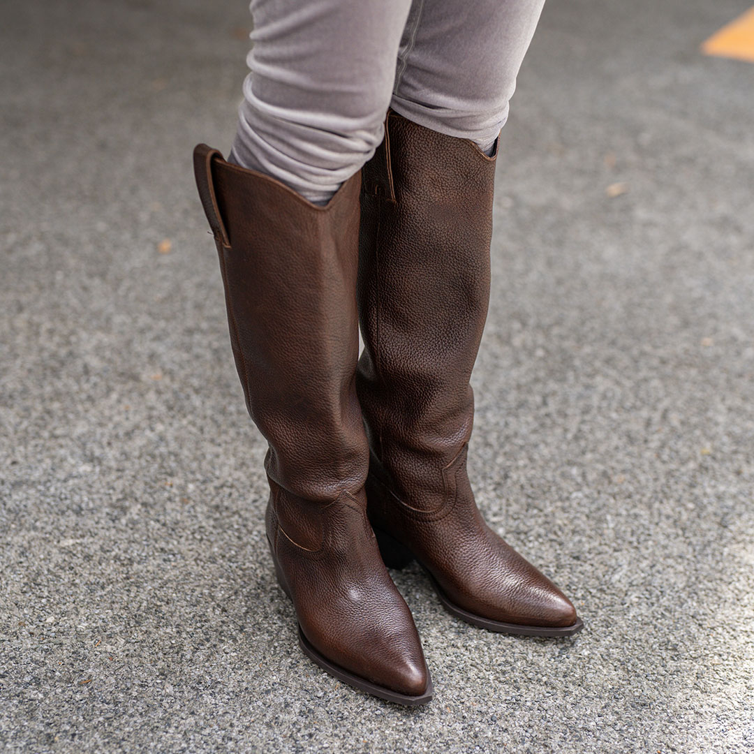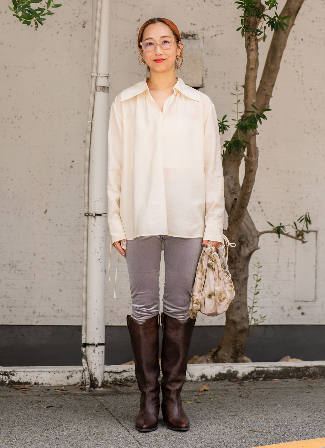 足元はグレーのレギンスに旬なウエスタンブーツをオン。ベロアとレザーを合わせて奥行きのあるスタイルに昇華!