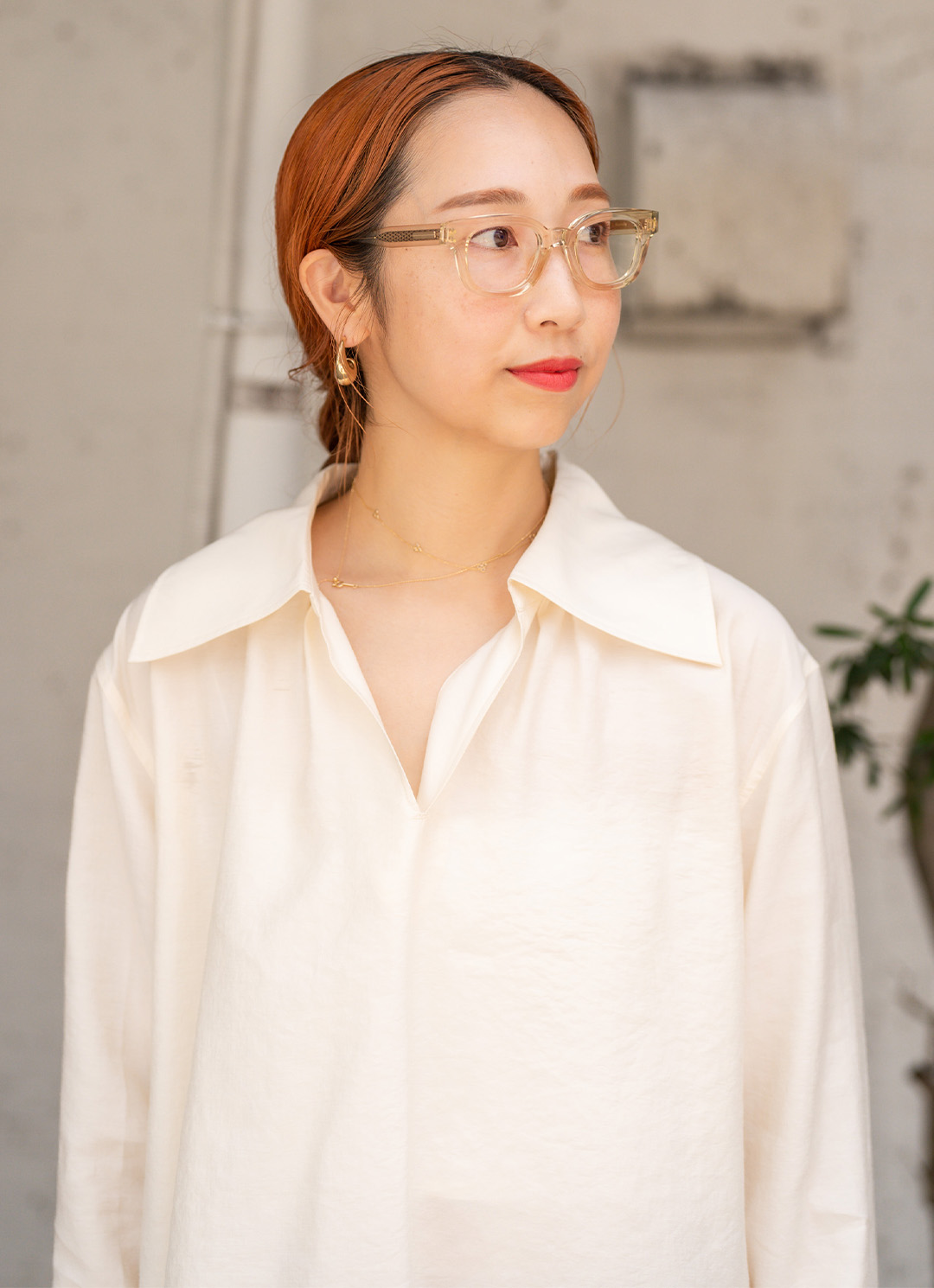 『ネイティブサンズ』のメガネは肌馴染みのいいイエローをチョイス。オレンジブラウンのヘアカラーと赤リップで、秋らしいあたたかみを感じる顔周りに。