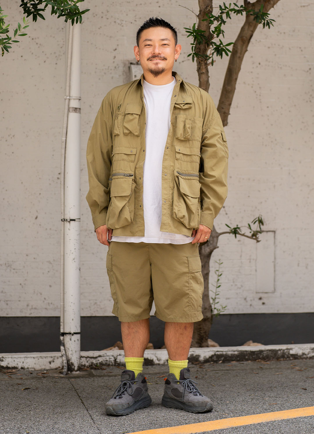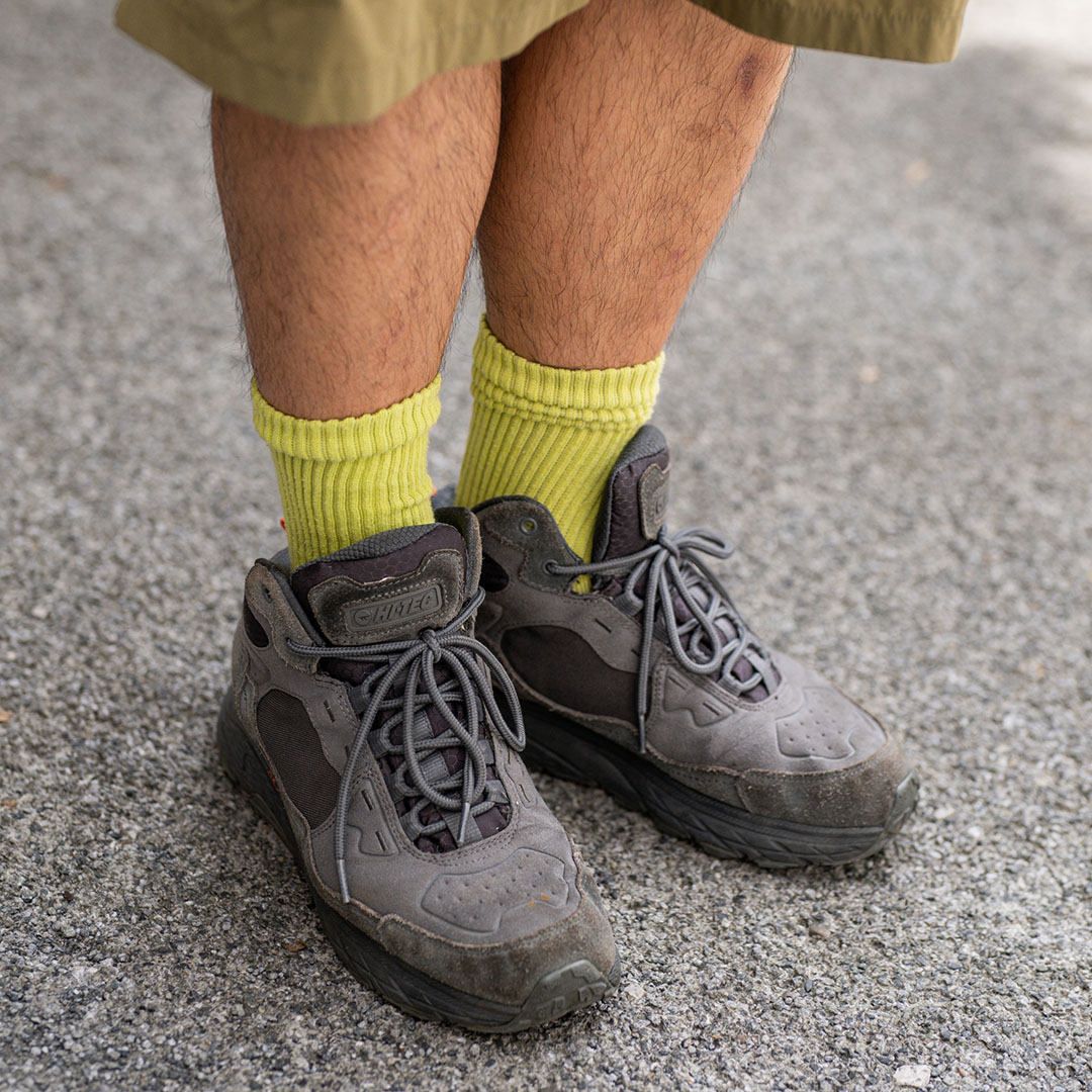 イエローグリーンのソックスが効いた足元。『フレッシュサービス』と『ムーンスター』のコラボスニーカーとの組み合わせで、ミリタリーテイストに遊び心をプラス。