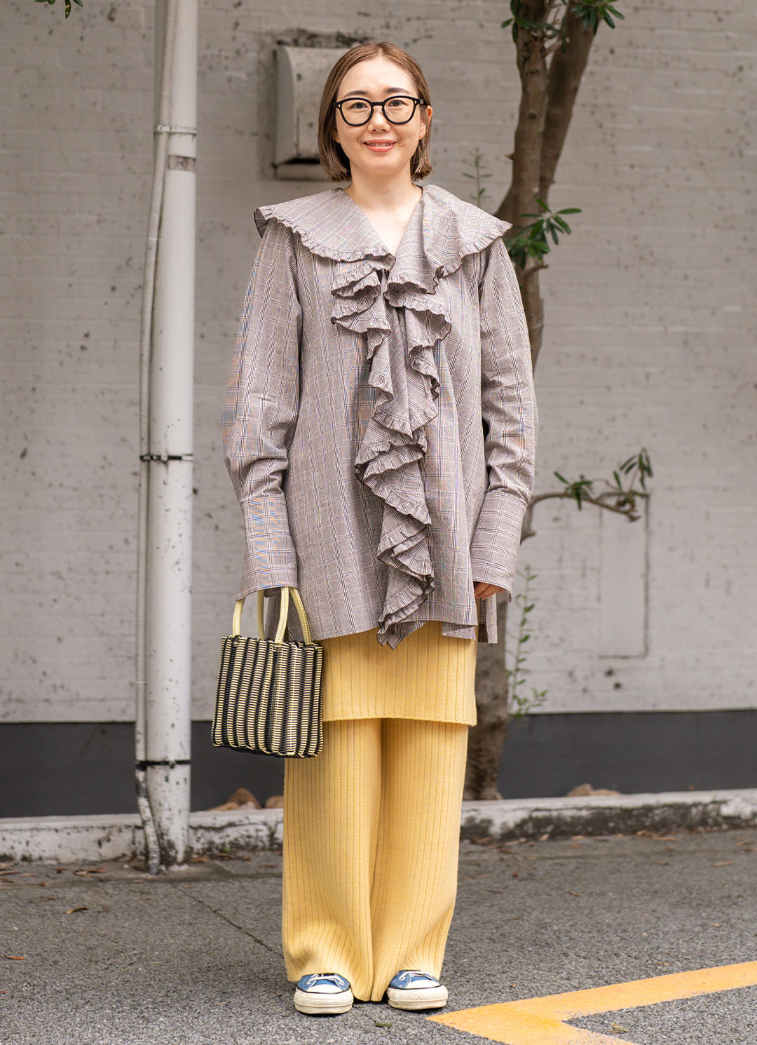 大きなフリルのブラウスが、装いを一気に華やかに格上げ。顔周りはハンサムな黒縁メガネで、引き締めたのがグッド!