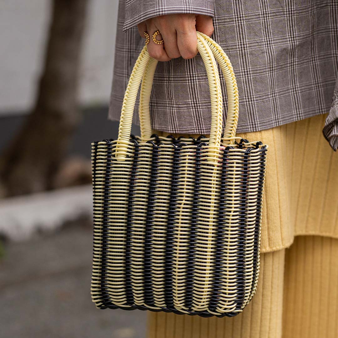 リサイクルプラスチックで編まれた籠バッグは『ラロ』のもの。エッジの効いた配色で、コーデにスパイスをひとふり。