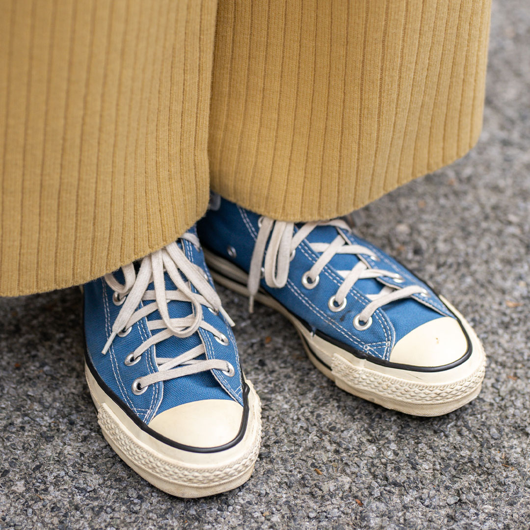 足元は『コンバース』のスニーカーでカジュアルダウン。イエローのボトムスとブルーのコントラストが新鮮!