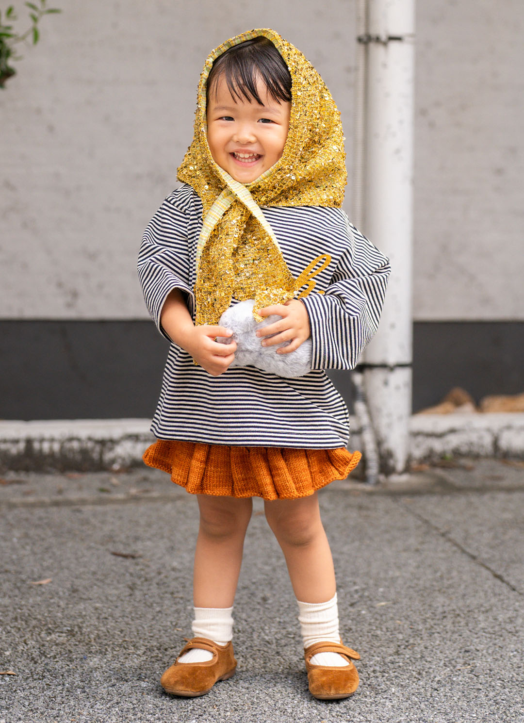 キーカラーをイエローに決めた親子コーデは、華やかなフリルやきらめくスパンコールを取り入れて、ハッピーな世界観をシェア! 甘くなりすぎないように、辛口アイテムを挿して、遊び心溢れる秋コーデが見事に完成。