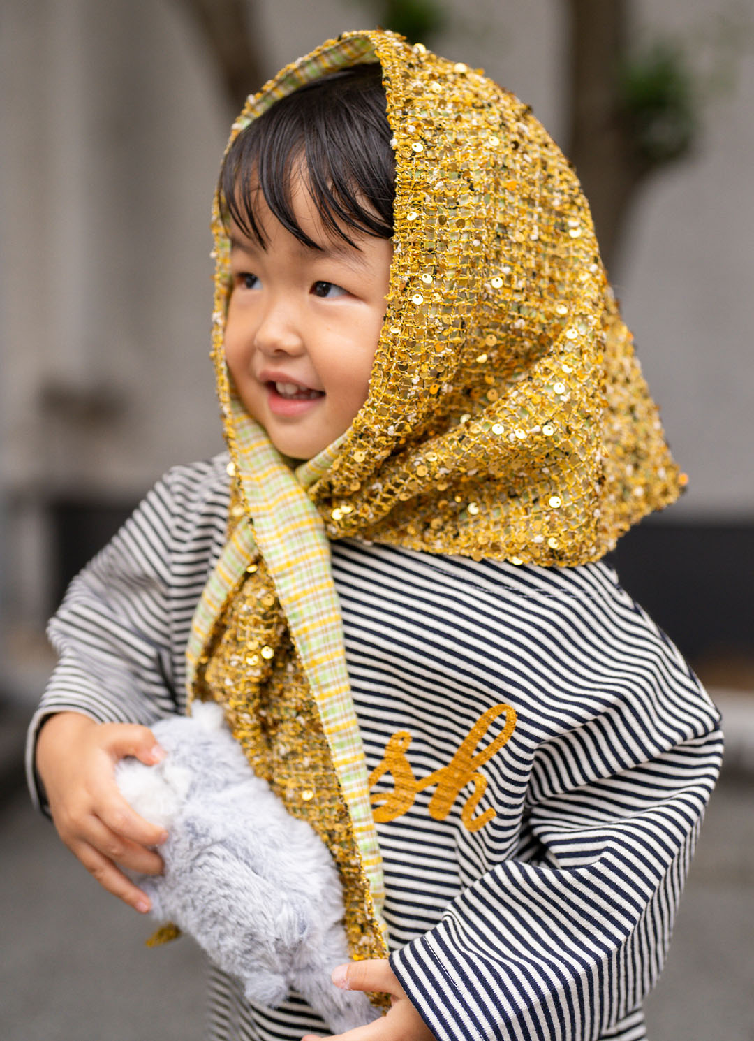 きらめくスパンコール が散りばめられたスカーフをひと巻。裏地がチェック柄だったり、ホールがついていたりと細かなデザインが効いているアイテム。