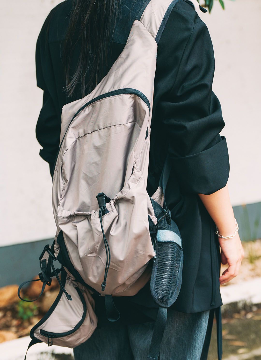 ヘアサロン『ロウン』の周年記念として、バッグブランド『ミーンズワイル』とコラボしたバッグパック。 機能的なデザインとニュートラルカラーが、秋のシックなスタイリングを格上げ
