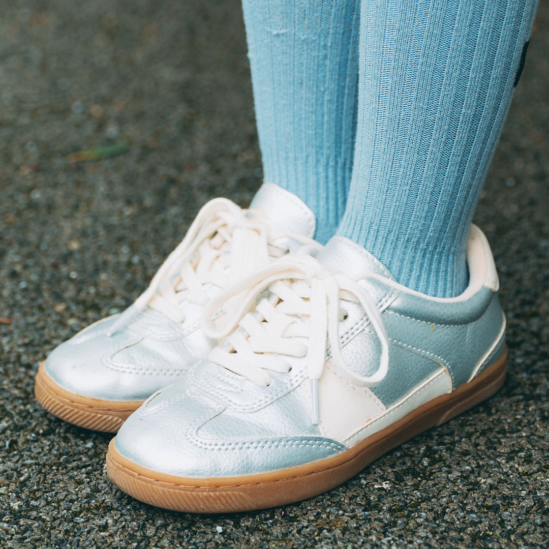 ペールブルーのソックスとメタリックなシルバーのシューズで、爽やかさを演出。淡いトーンでまとめた足元が、全身のダークトーンをチューニング!
