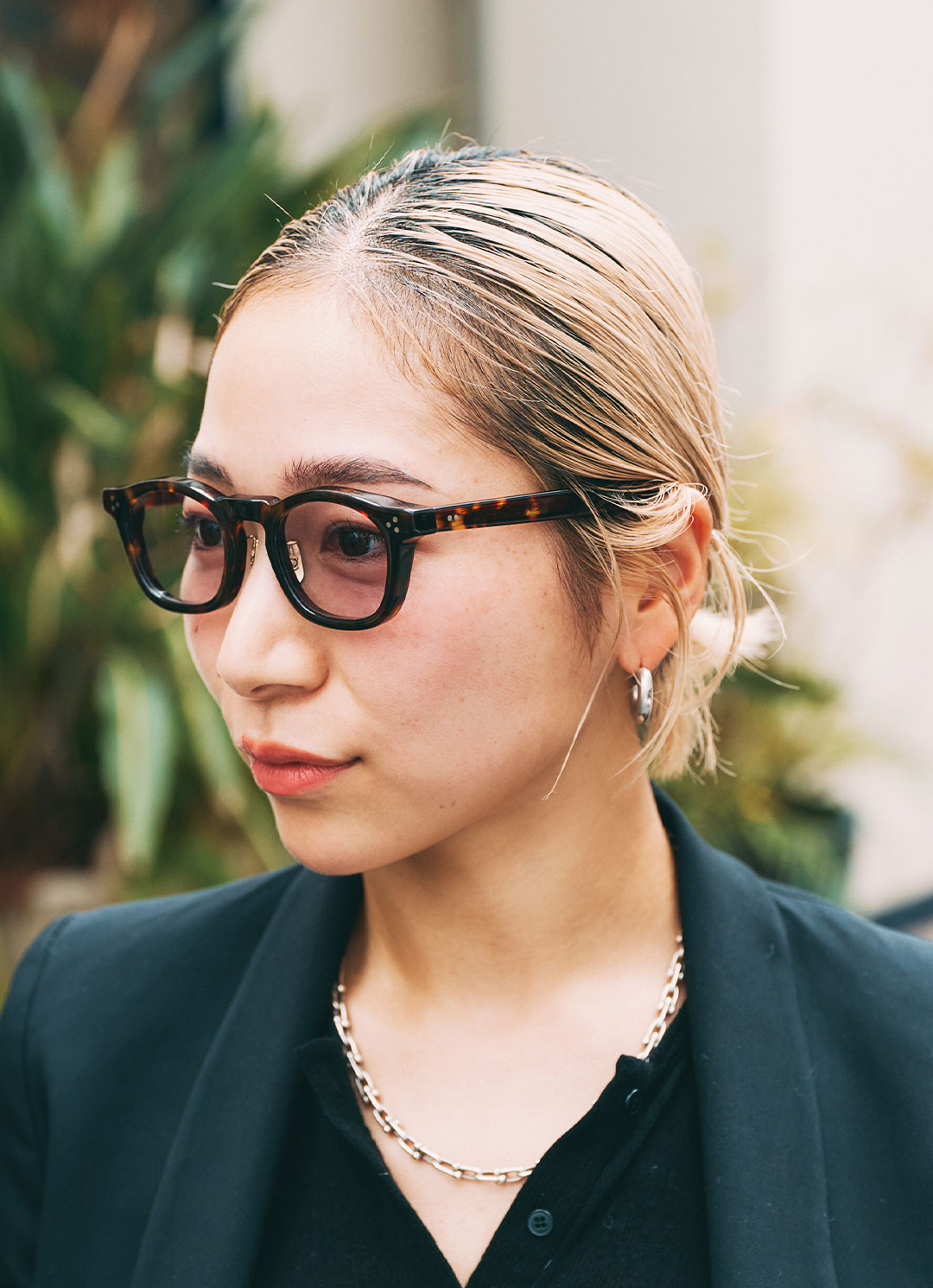 ベッコウ柄のメガネで秋ムードを加速! シルバーのピアスやチェーンネックレスで、落ち着いた上品さをプラス。