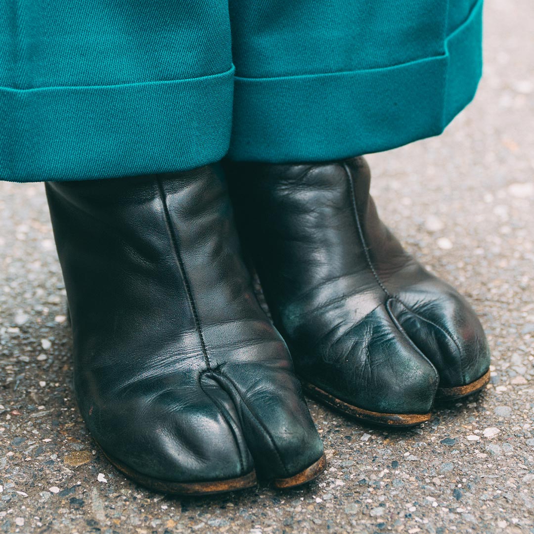 『メゾン マルジェラ』の足袋ブーツがターコイズブルーのボトムスと絶妙にマッチ! モードスタイルには欠かせないアイテム。