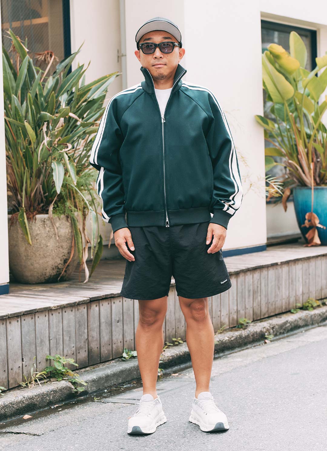 『O〜Z/オーゼット』のセットアップでつくる、こなれ感漂うカジュアルコーデ。ハットとスニーカーはホワイトにして、引き締めたのがグッド!