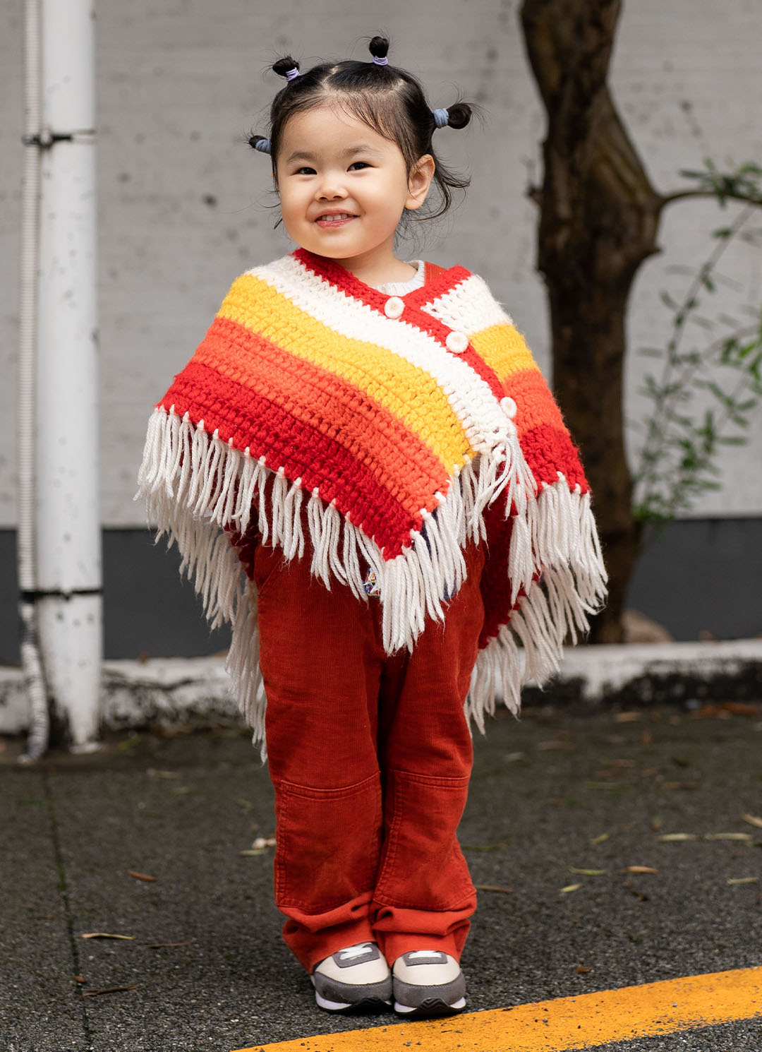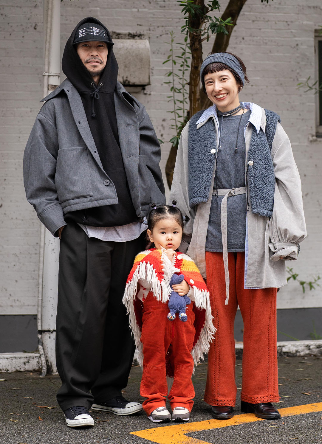レッドとグレーを家族でシェアして、ママはレイヤードスタイルに、パパはストリート、キッズはレトロコーデとそれぞれの装いを満喫。キッズの鮮やかなポンチョやボアベストなど冬素材をを取り入れて、あたたかさのある家族コーデの完成!