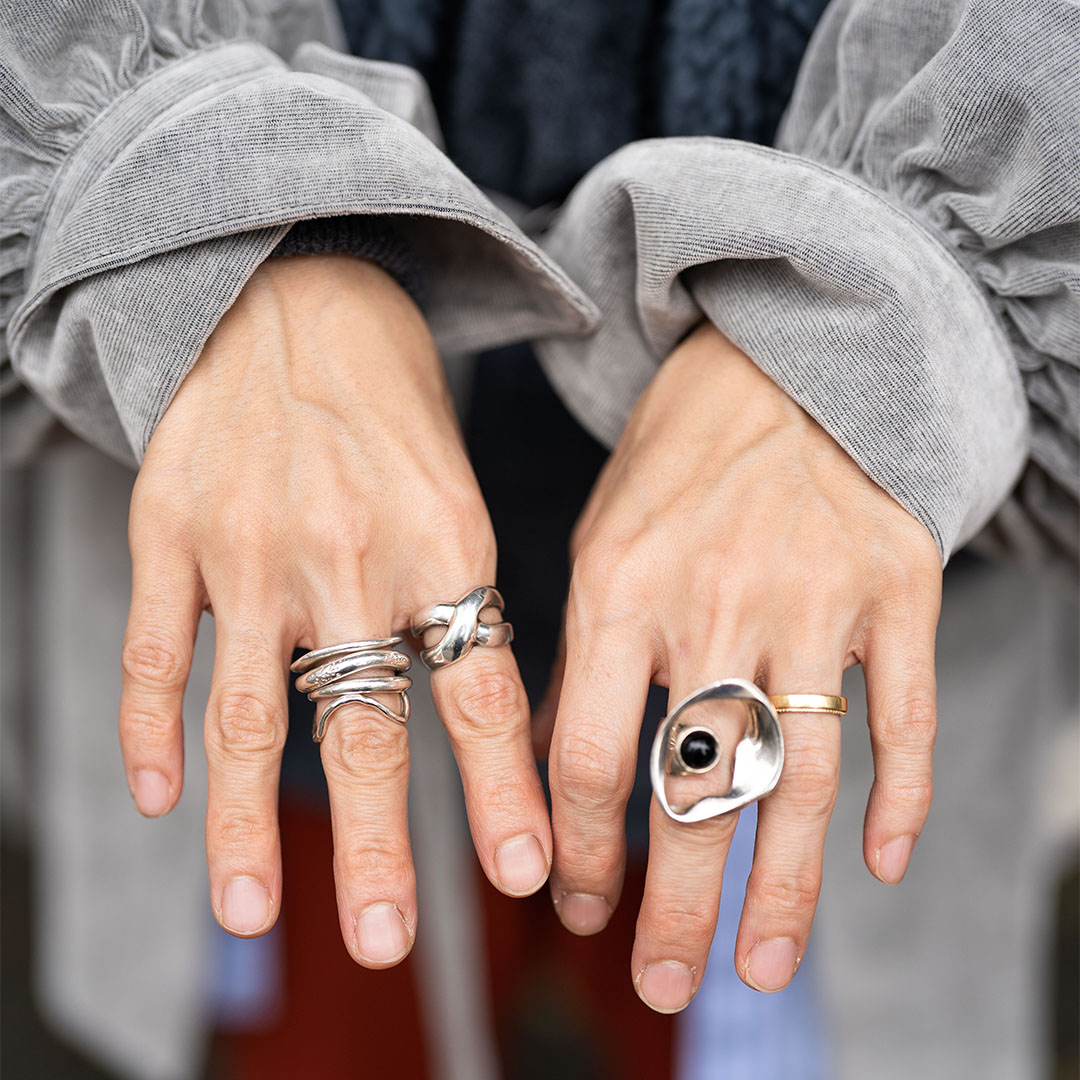 ユニークなシェイプのリングを散りばめて、華やかな手元に昇華! カジュアルなコーデもグッと引き締まる。