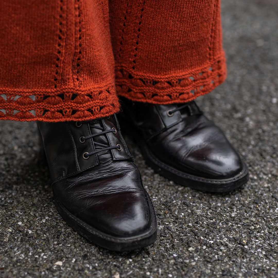 レース編みのニットパンツと、ブラックレザーのレーズシューズのコンビネーション。足元のディテールまでこだわり抜いた、あたたかみのあるスタイリング。