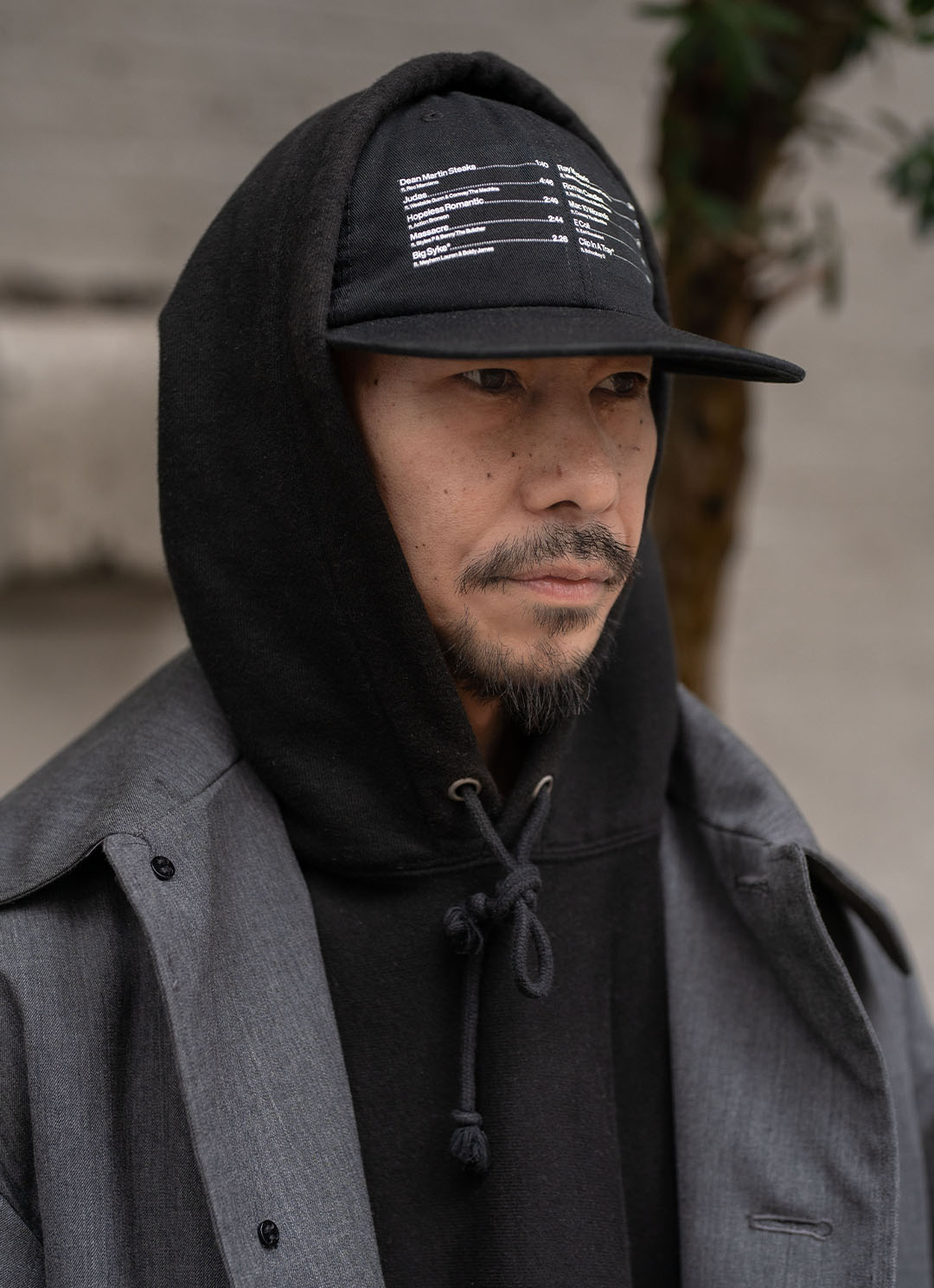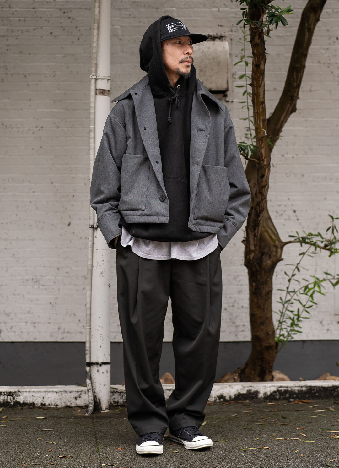 『ALCレコーズ』のハットのグラフィックが、モノトーンコーデのアクセントに。フーディにグレーのジャケットを羽織って、都会的な雰囲気を演出。
