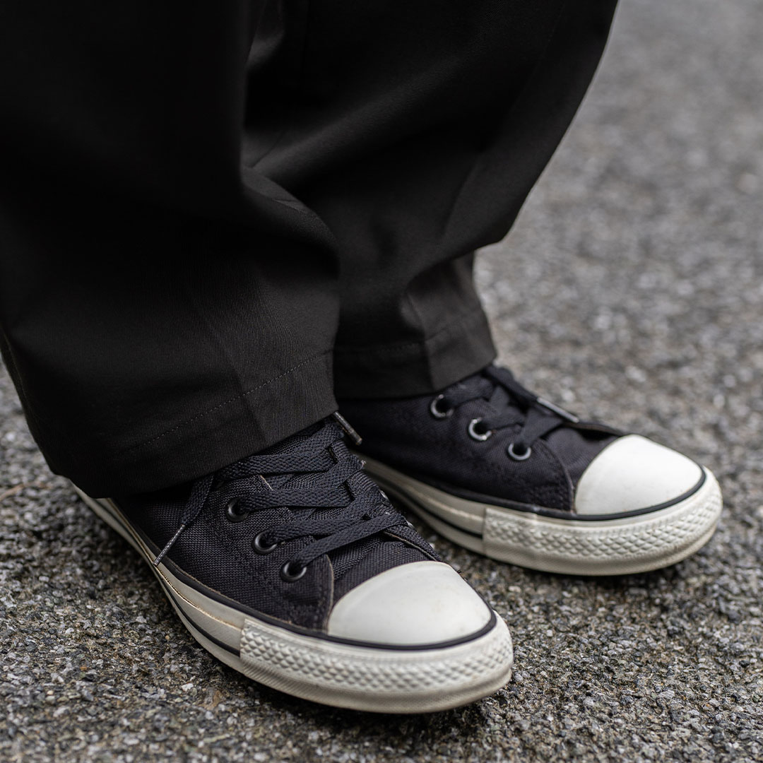 『コンバース』のスニーカーはすっきりとしたフォルムで、程よいカジュアル感が魅力。きちんと感のスラックスに抜け感をプラス!