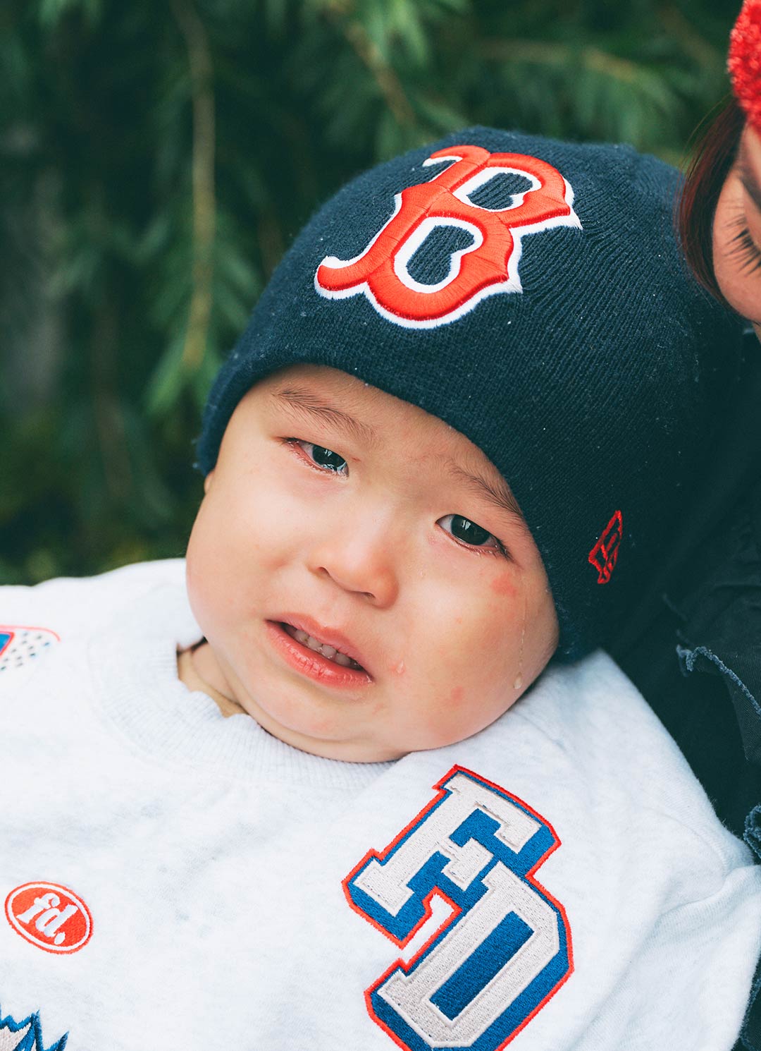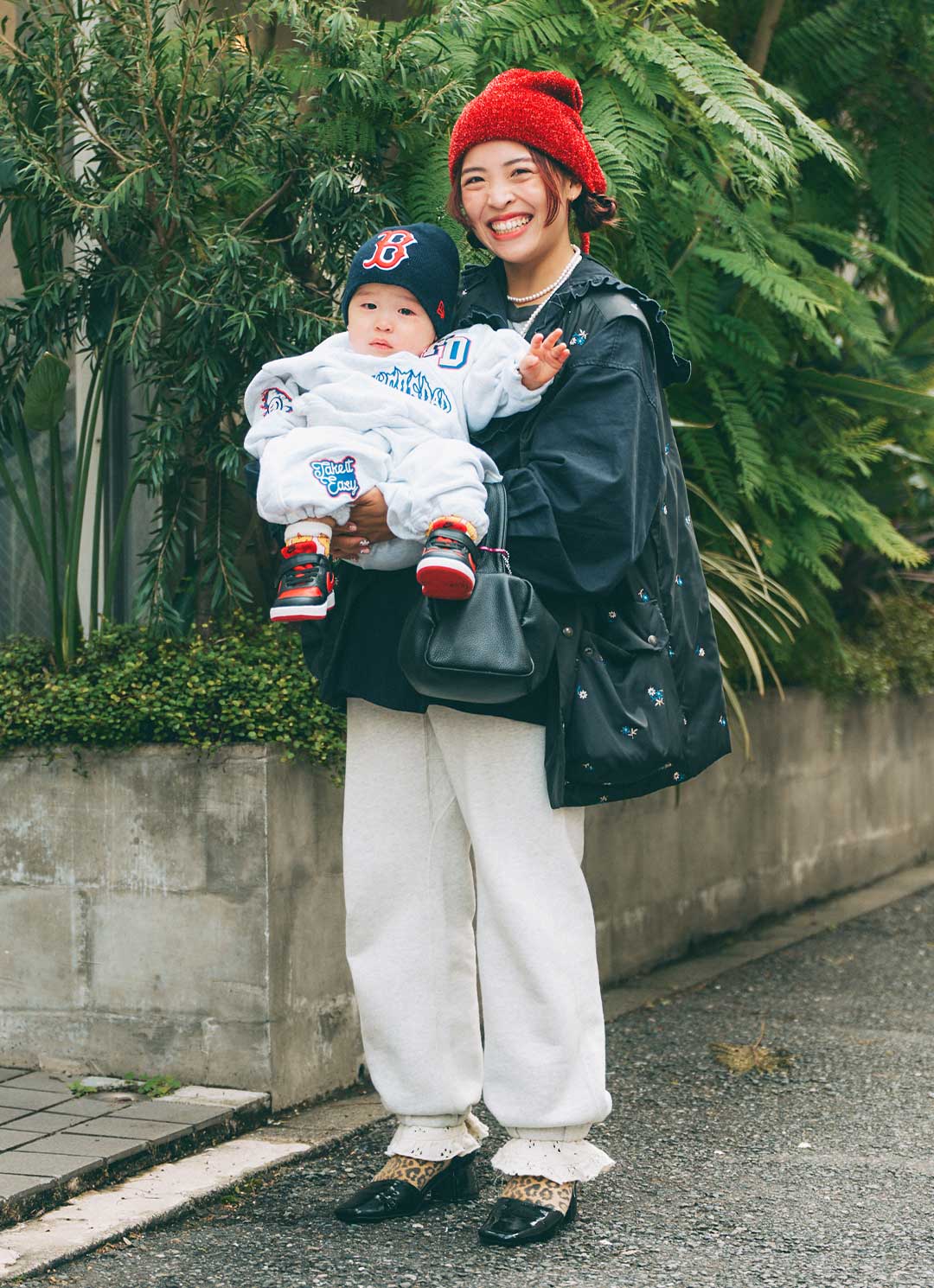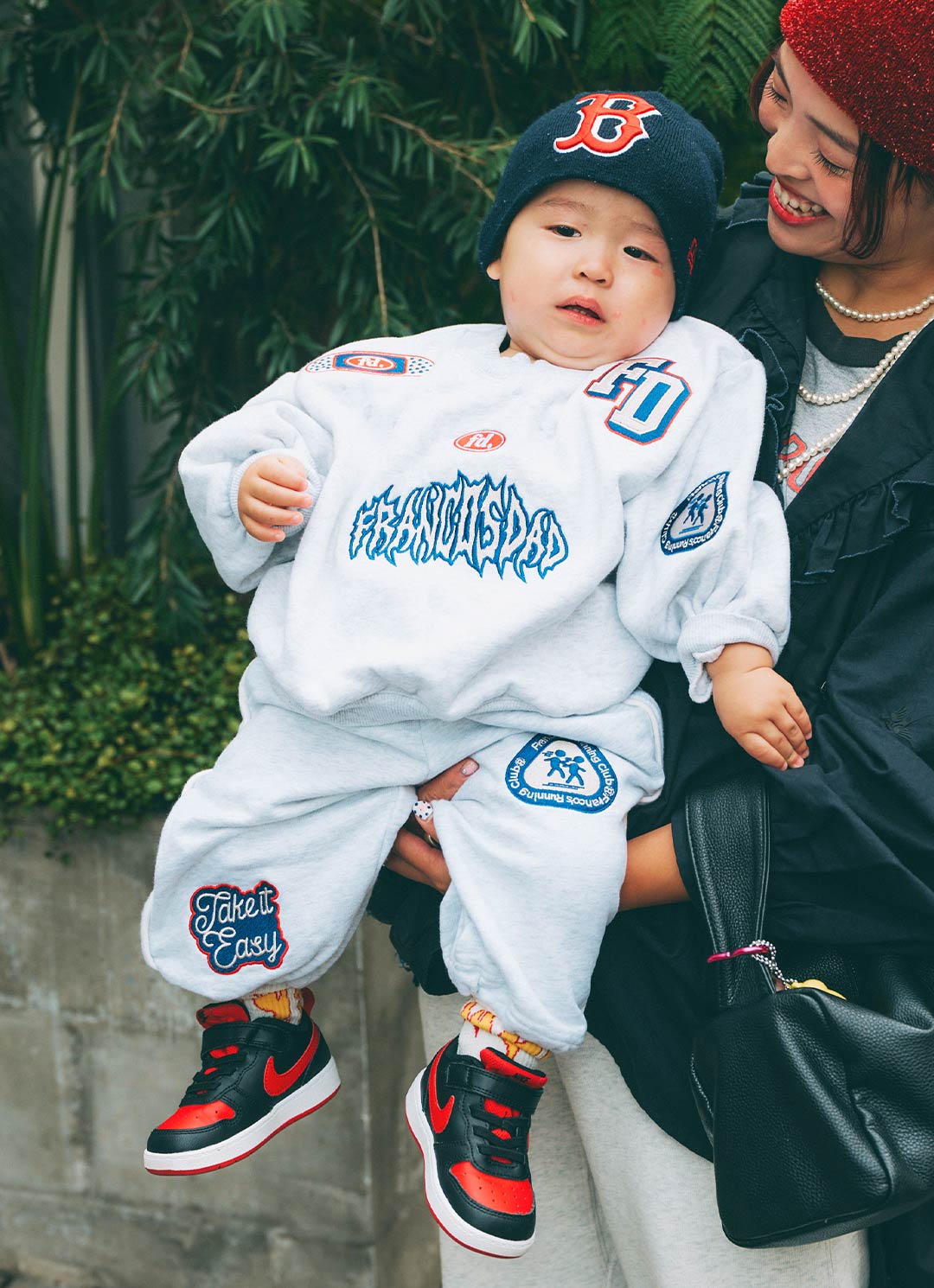赤のロゴがインパクトあるニット帽で寒さを撃退! ベビーでもとことんストリートスタイルを満喫♪