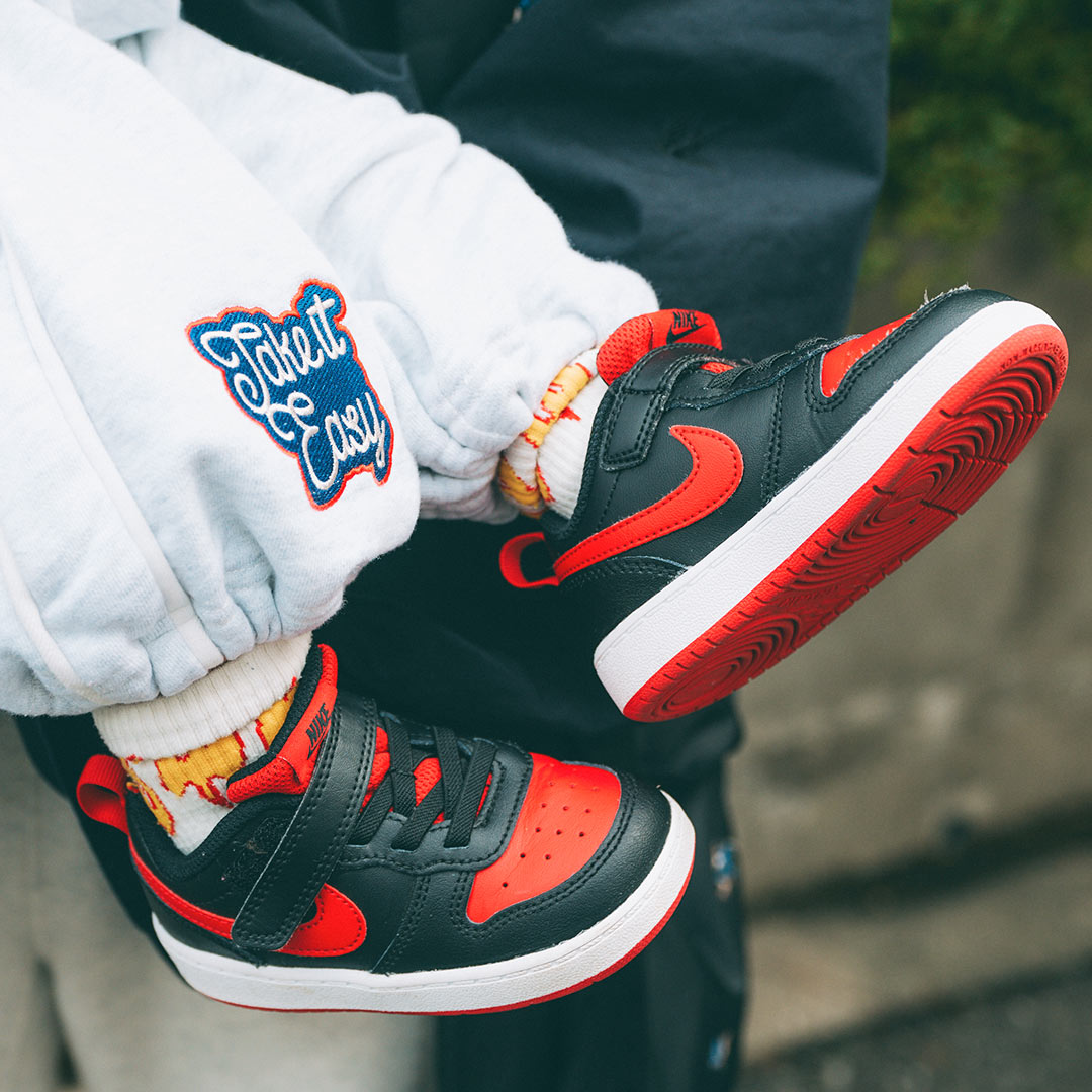 足元は『ナイキ』のコートバーロウのスニーカーをチョイス。ニット帽とシェアしたカラーリングでスパイスオン!