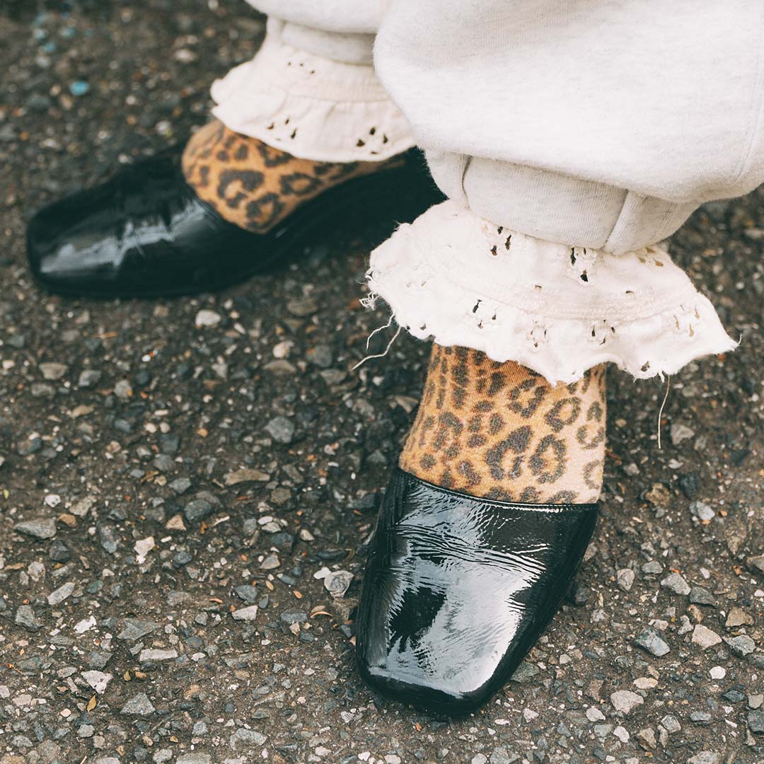 レオパード柄のソックスとブラックのエナメルパンプスと上品なスタイリング。カジュアルになりすぎないよう、足元でバランスを取ったのがグッド!