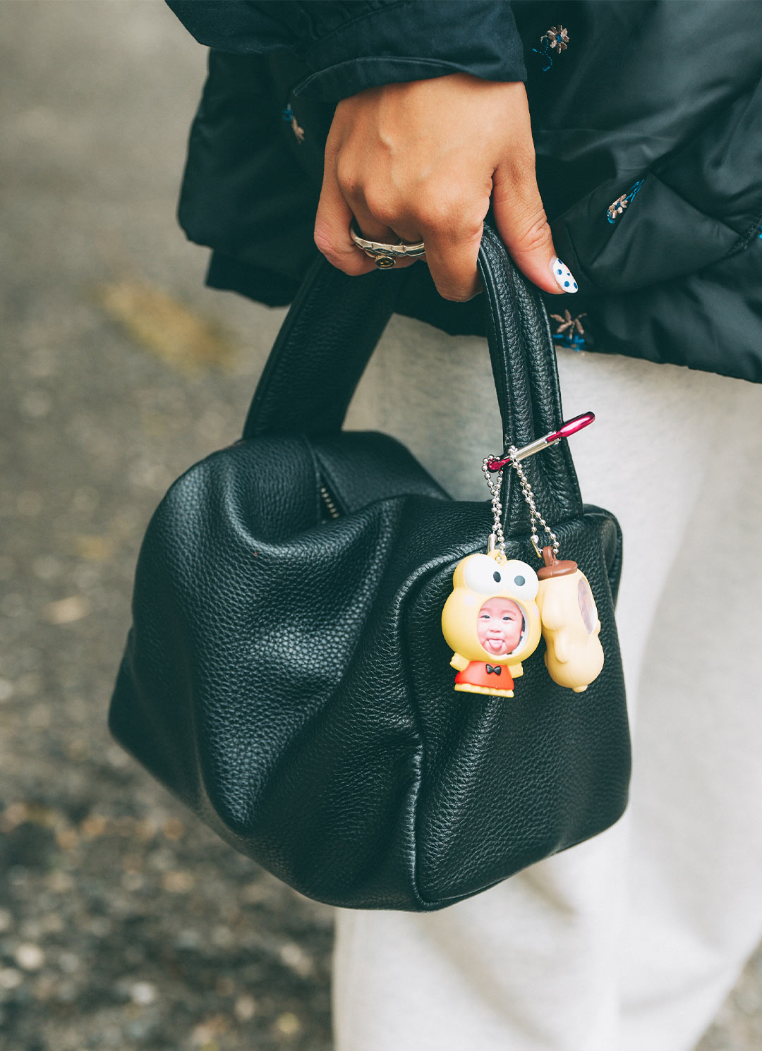 バッグはミニマムなデザインにブラックレザーでコーデを落ち着かせて。キッズの写真が入ったキュートなバッグチャームで遊び心も忘れずに。