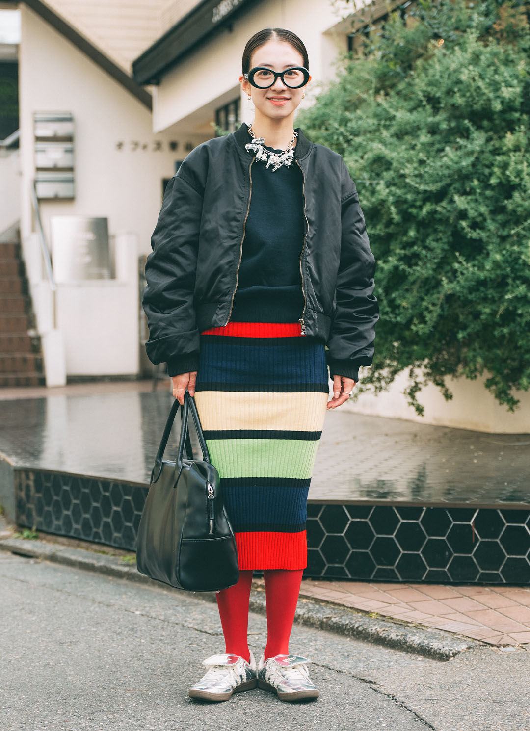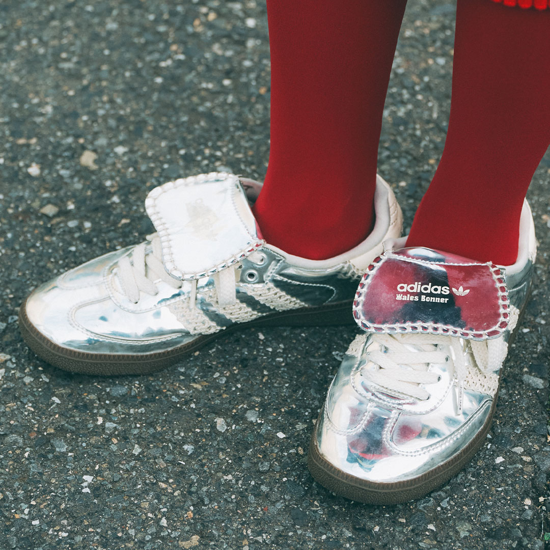 足元は『アディダス』と『ウェールズ ボナー』のコラボスニーカー。メタリックシルバーのアッパーとレッドタイツのコンビネーションが、冬コーデに遊び心とモード感を演出。