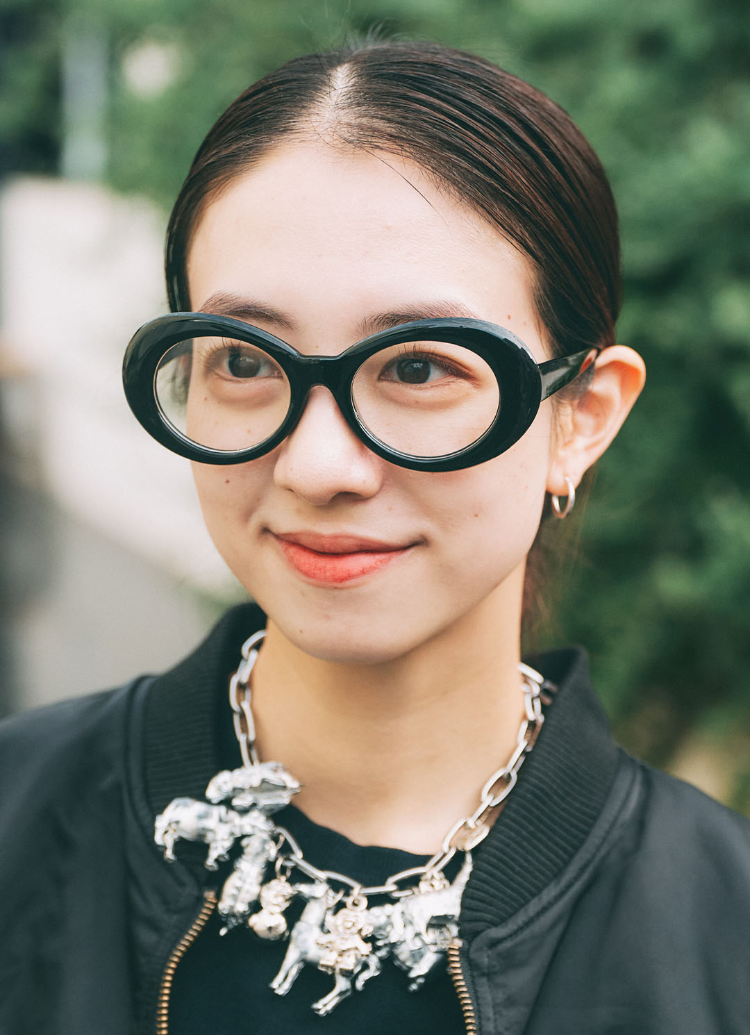 シルバーチェーンの動物チャームネックレスがなんともユニーク。ボリューミーなメガネを合わせて、顔まわりにインパクトを集中!