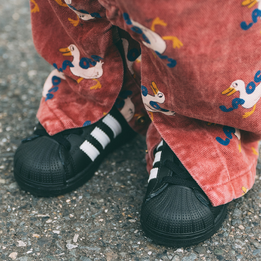 親子で『アディダス』のシューズを揃えて、統一感UP! ブラックカラーで、あたたかな素材のコーデを引き締めて。