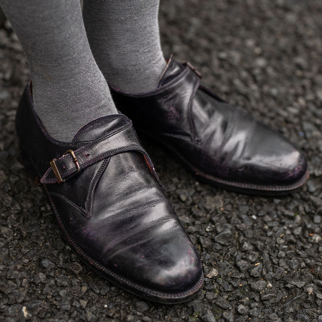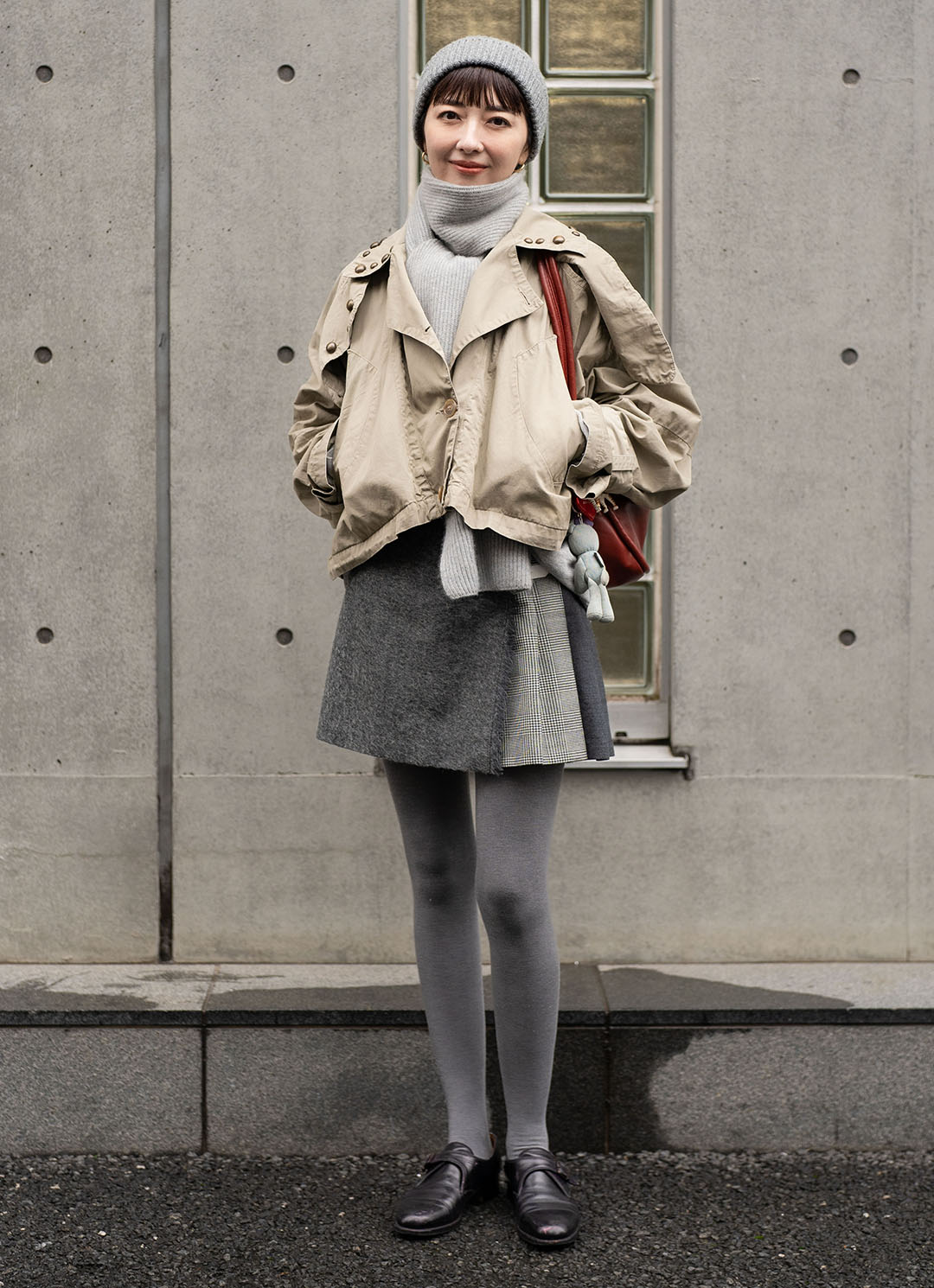シャープなレザーシューズでコーデを引き締めて。グレータイツでマイルドに仕上げたのがポイント。