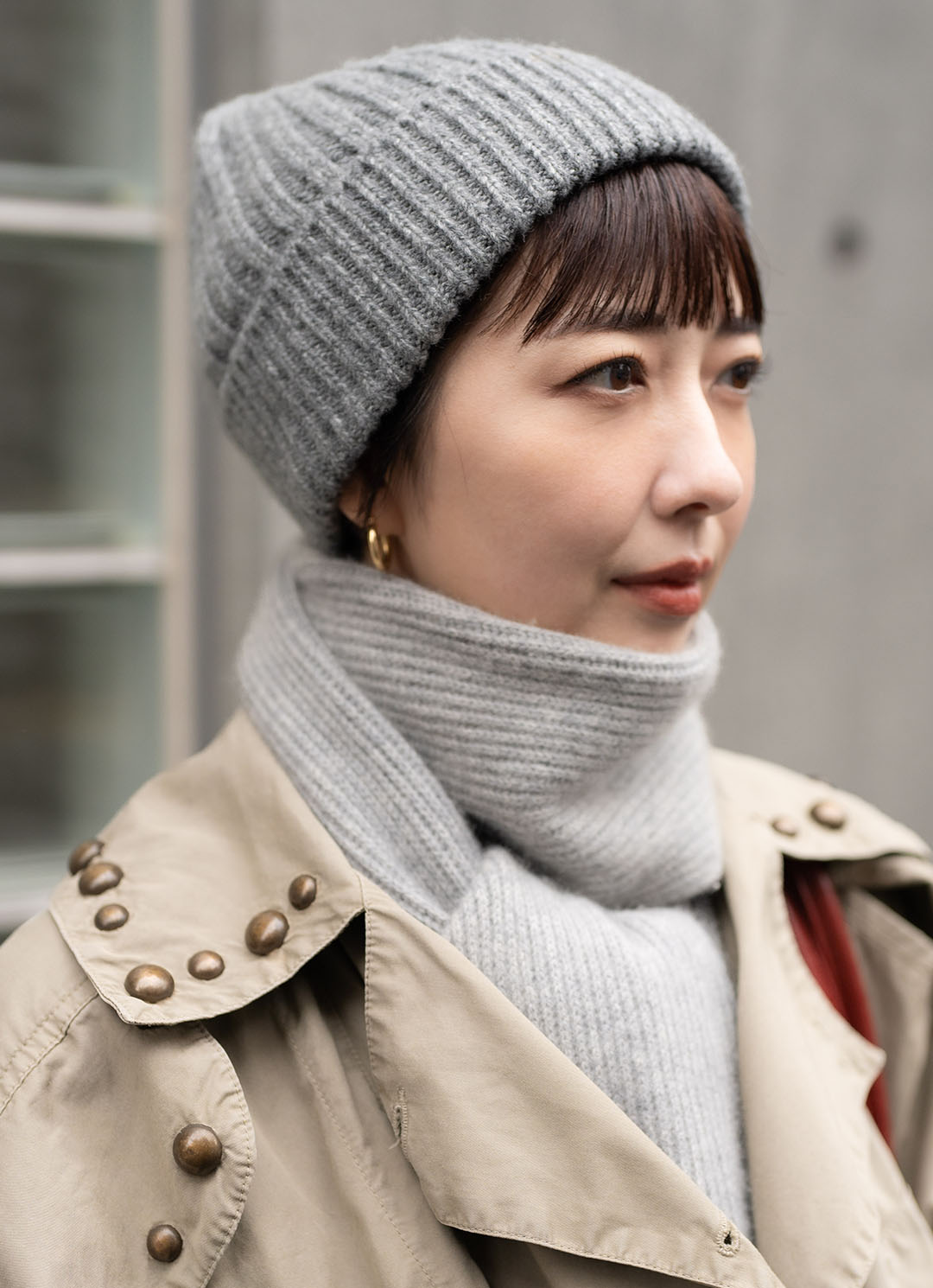 ニット帽とマフラーをグレーで統一して、こなれ感漂う顔周りに昇華! ゴールドのイヤリングで華やかさも忘れずに。