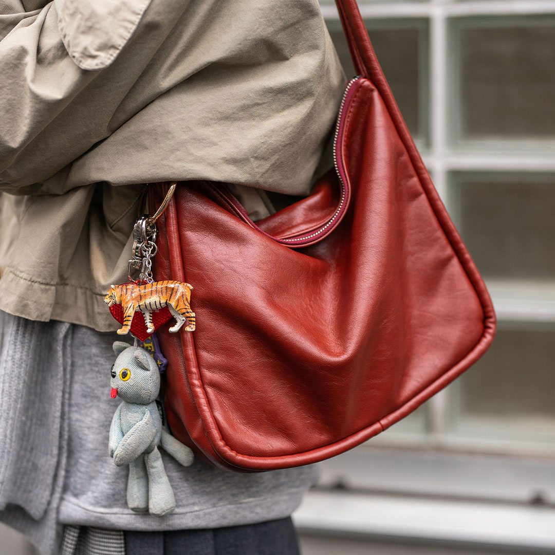 深みのあるレッドの『ヨミム』バッグが、グレーコーデの挿し色役にぴったり! じゃらりとつけたユニークなチャームが、楽しげなアクセント。