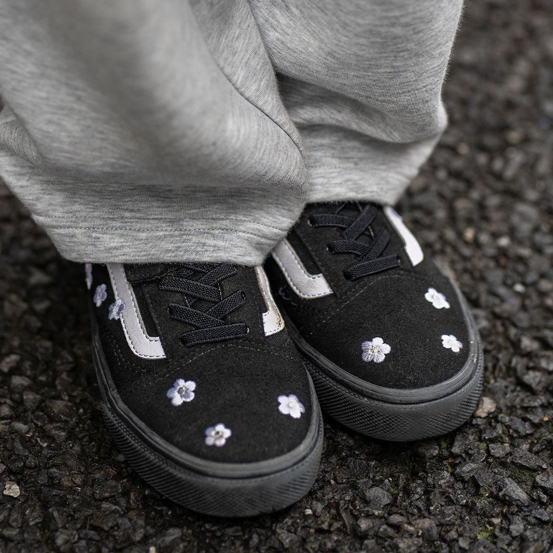 お花のアクセントがキュートな『ヴァンズ』のスニーカー。クールな装いのなかに、遊び心を散りばめて。