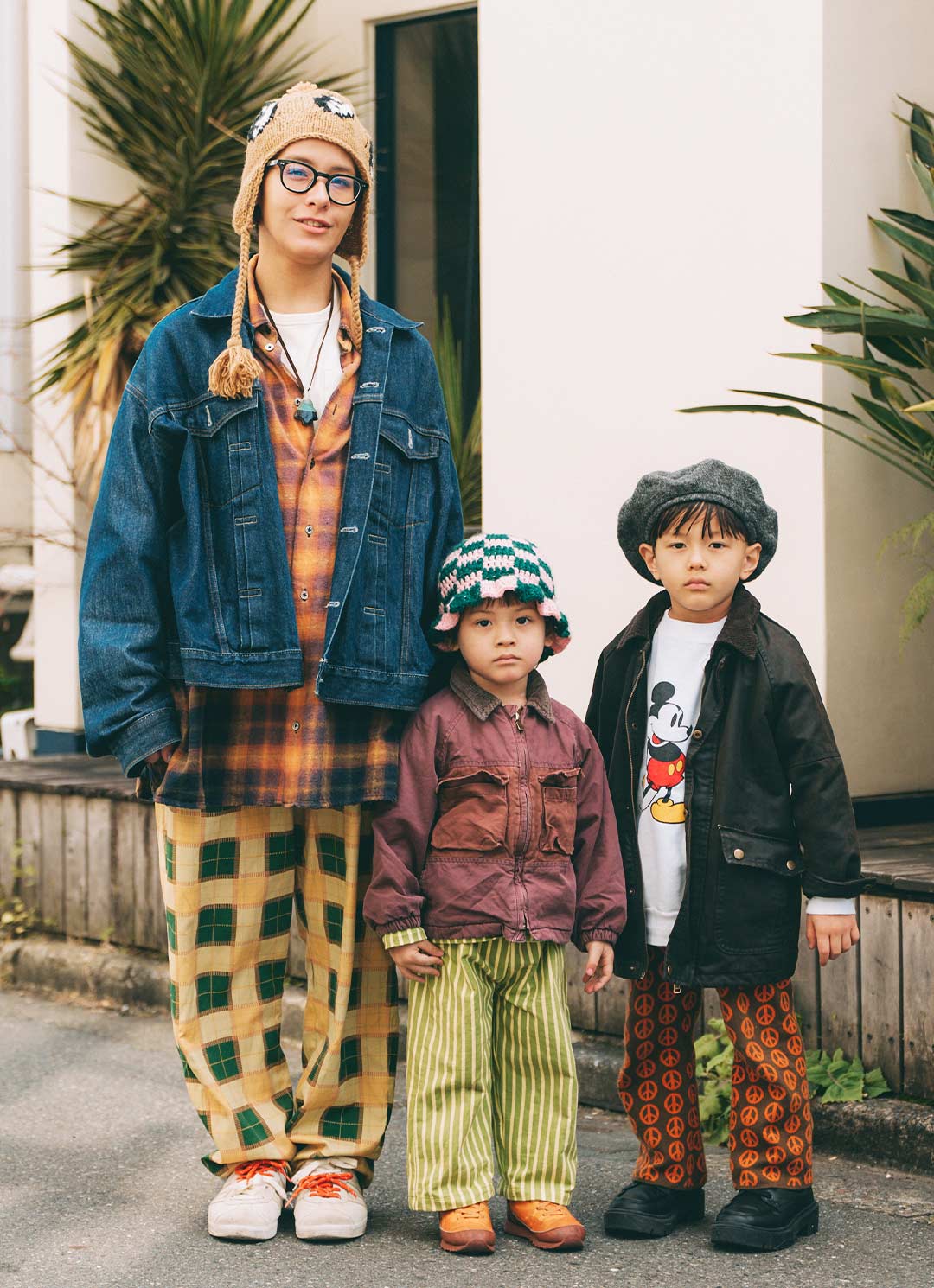 チェックやストライプを取り入れて、リズミカルに仕上げたファミリーコーデが楽しい! みんなで冬らしいハットを被って、統一感を演出したのがポイント。いろいろなカラーを使っても、家族でシェアすれば、まとまり見えが叶う。