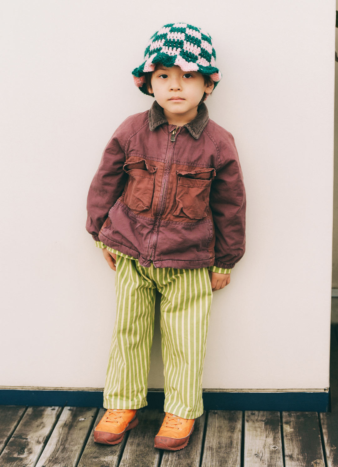 グリーン×ピンクの配色が可愛いバゲットハットをオン! ハンドメイドならではのあたたかさを感じる特別なアイテム。