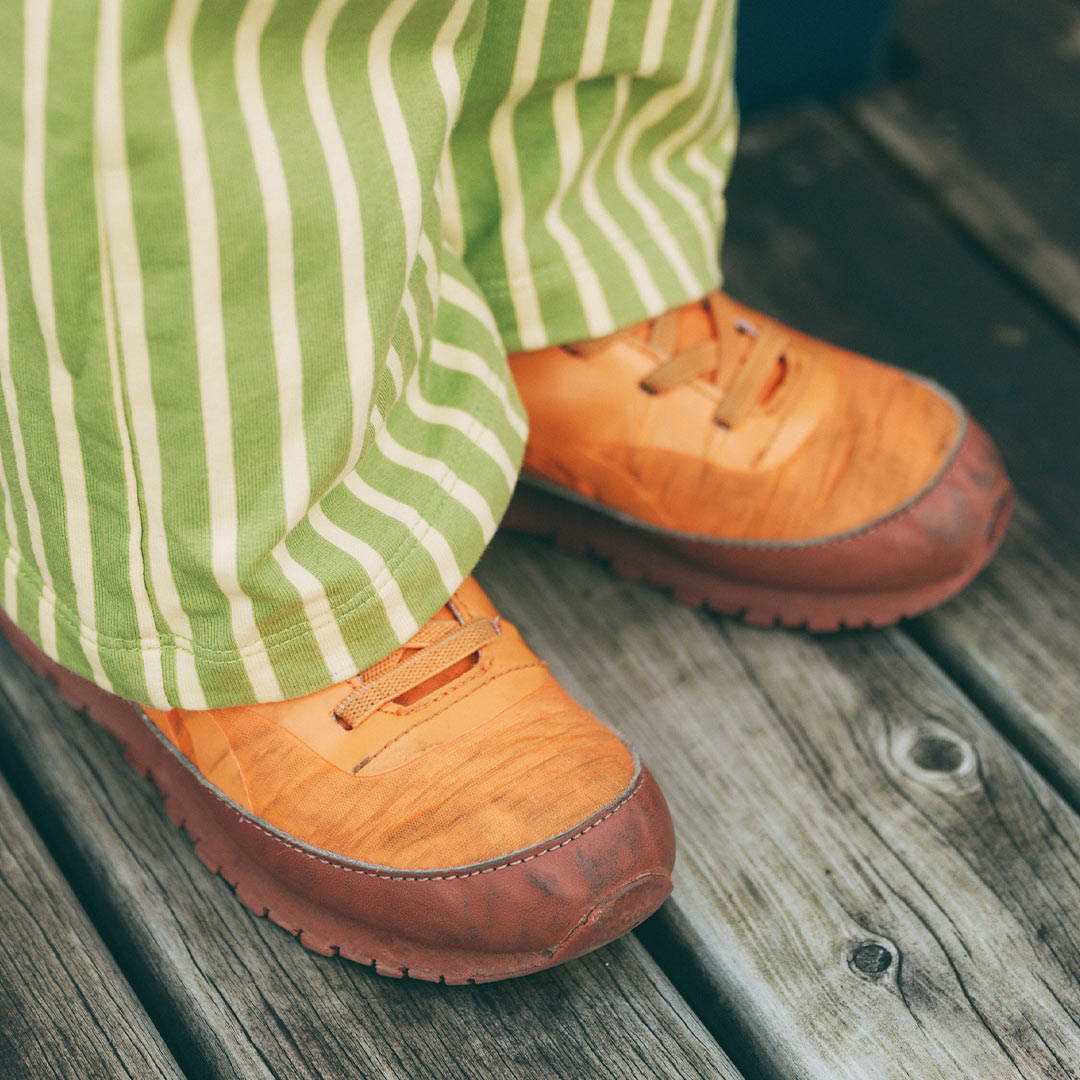 『アディダス』のガゼルを、冴えるオレンジのシューレースにアレンジ。色を変えるだけで、簡単にオリジナリティが上がるから、ぜひ真似したいテク。