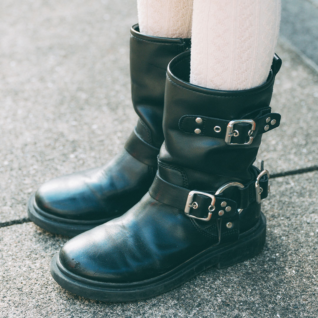 足元はスパイシーなブーツでコーデを引き締めたのがポ◎。ベイカーパンツともバランスのよい丈感をセレクト!