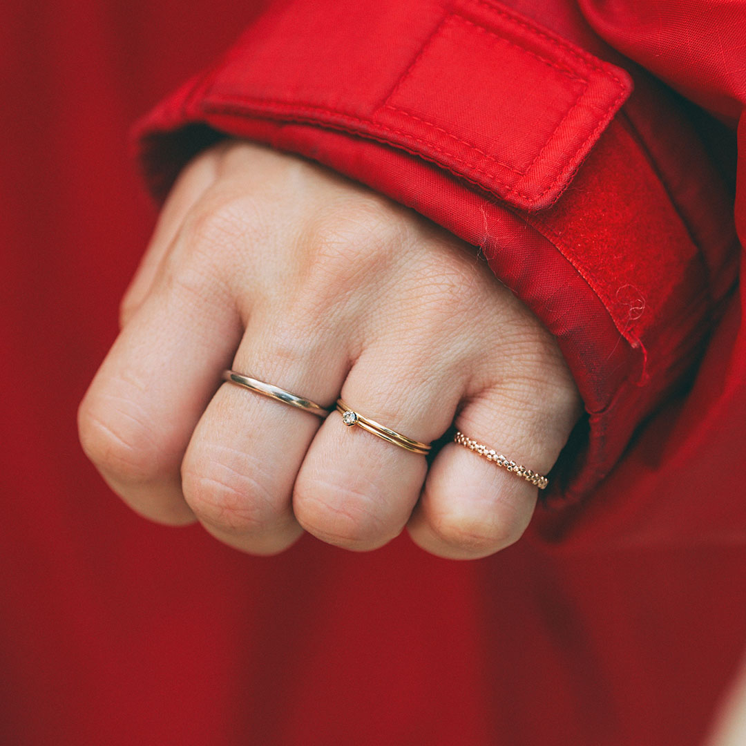 繊細なリングをリズミカルに並べて華やかな手元にまとめ。メンズライクな装いをレディさを足して、洗練されたスタイルの完成。