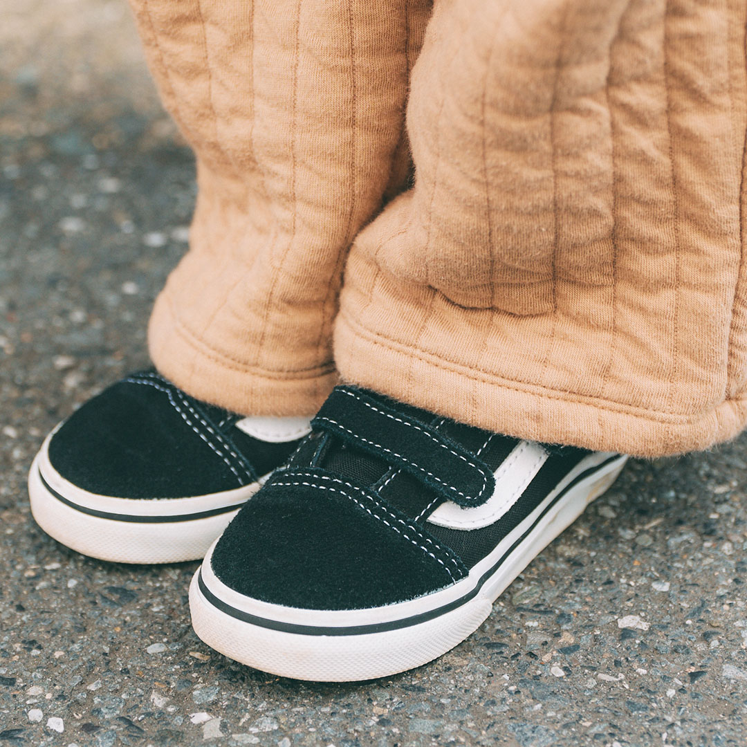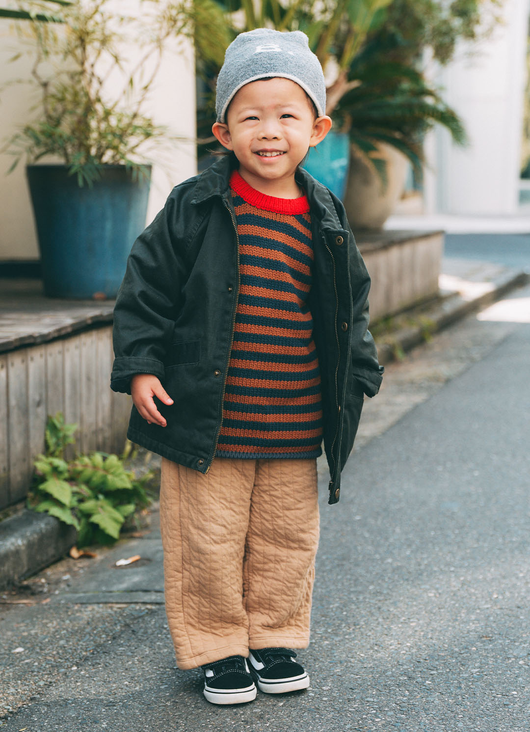 あたたかなキルティングパンツを『ヴァンズ』の定番スニーカーで引き締め。ジャケットから色を拾って統一感アップ!