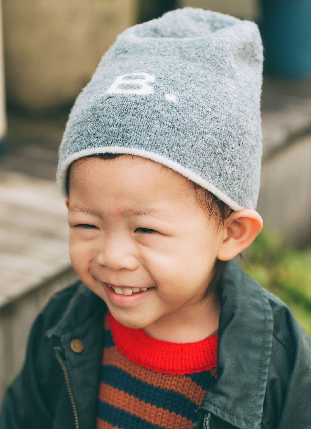 『アニエスベー』のグレーニット帽がお兄さんなアクセントに。ふわふわの質感が冬らしく、表情豊かなスタイリングが魅力的♪