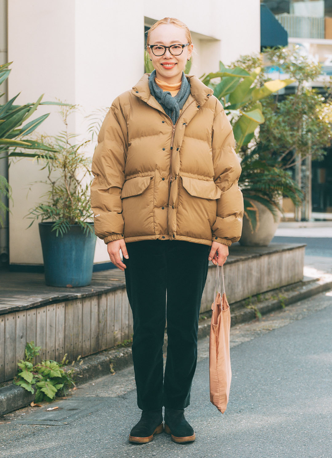 やさしいライトベージュのバッグ。ミニマムなデザインと軽やかな質感が、冬コーデに奥行きを出してくれる。