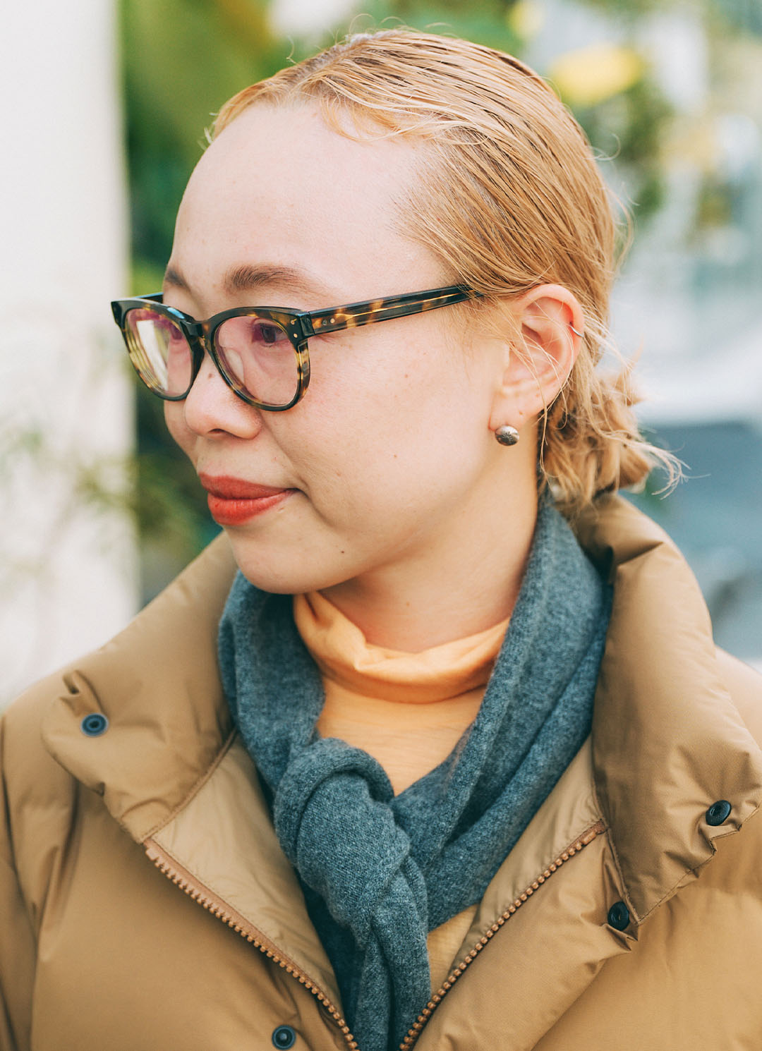 オレンジのインナーとグレーのカシミヤマフラーが絶妙な温度感を演出。べっこう柄のメガネでトラッド感もプラス!