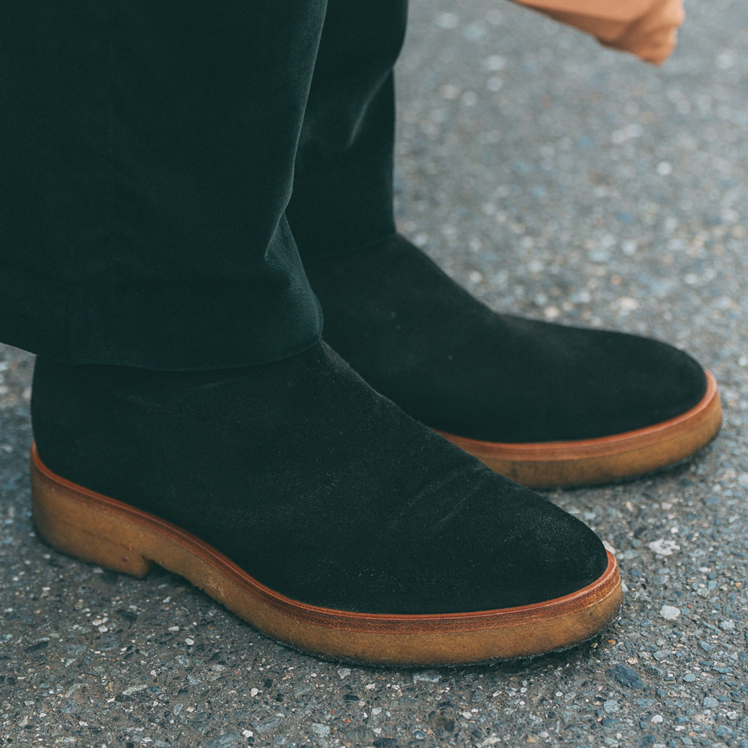 足元は冬らしい重厚感のあるスウェードシューズをオン。ソールのブラウンが温もりをプラスして、シンプルながらも存在感のあるデザイン。