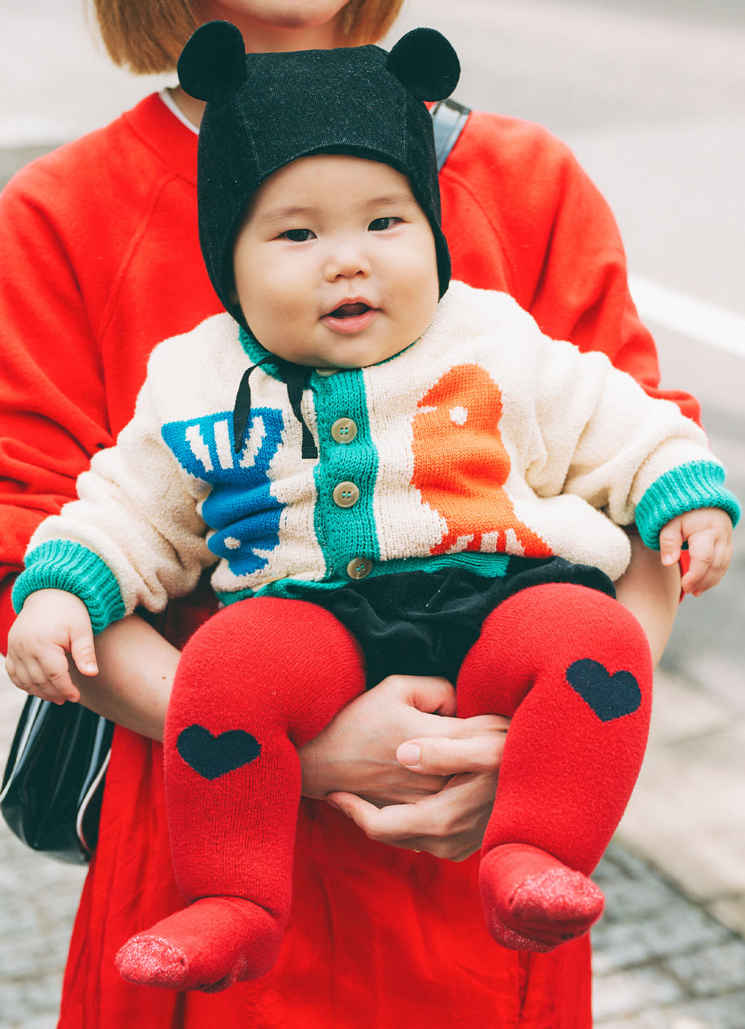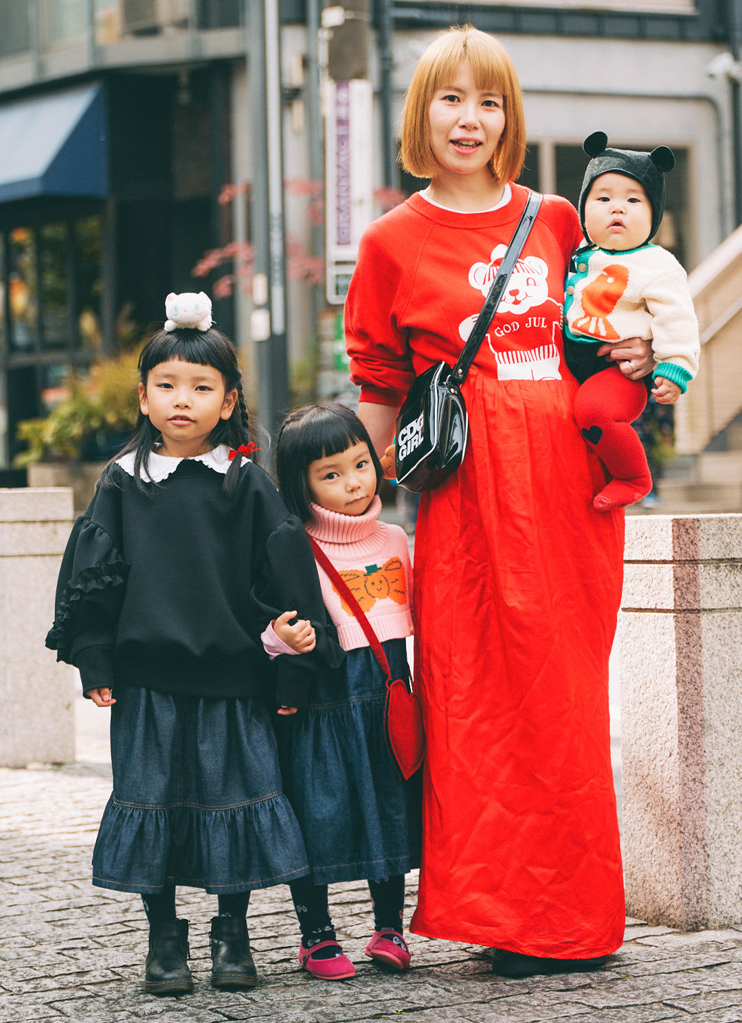 鮮やかなレッドをキーカラーにした家族リンクコーデは、デニムアイテムとブラック小物で引き締めてモードにアップデート! クマモチーフやハート柄で遊び心をプラスして、冬の街に映えるハッピーなファミリースタイルが完成♪