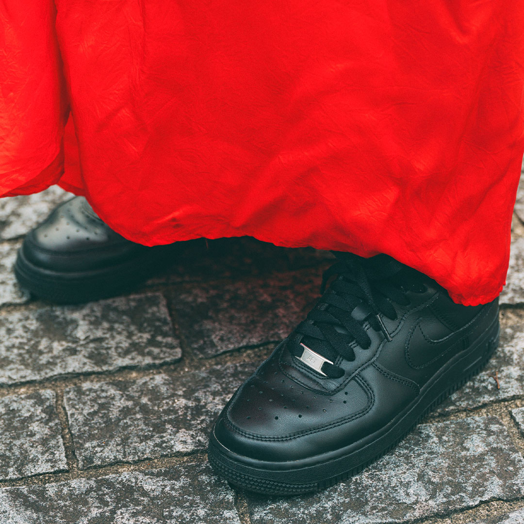 赤いワンピースの足元は、『ナイキ』のエアフォースワンでカジュアルダウン。ブラックをセレクトして統一感を出したのもグッド!