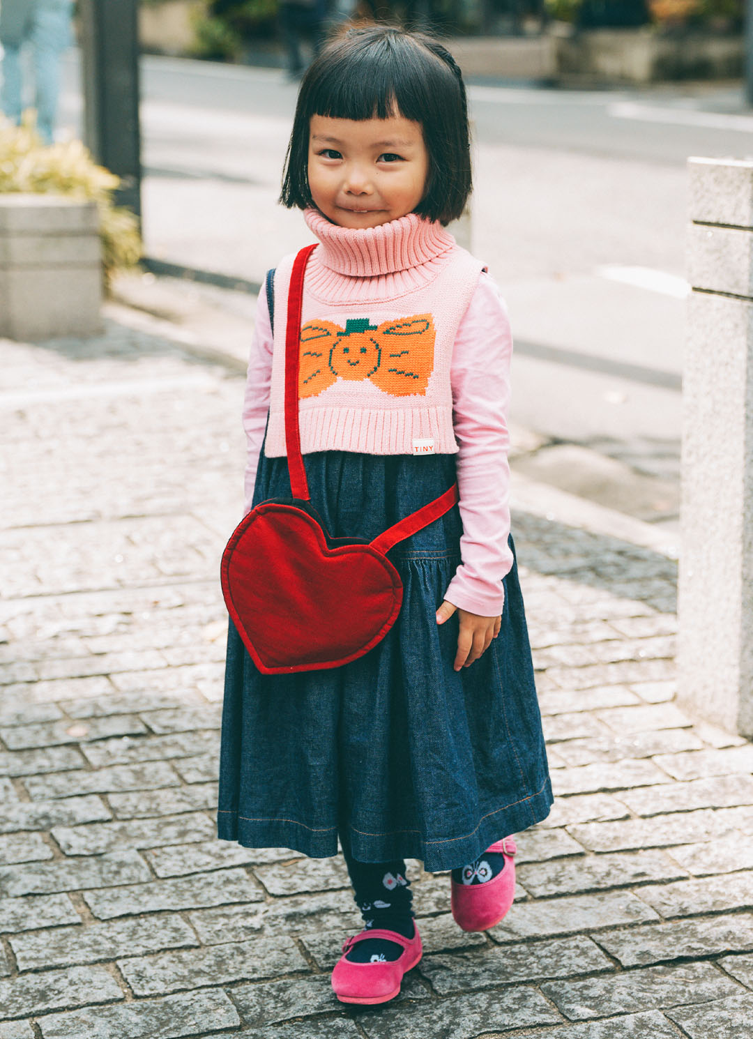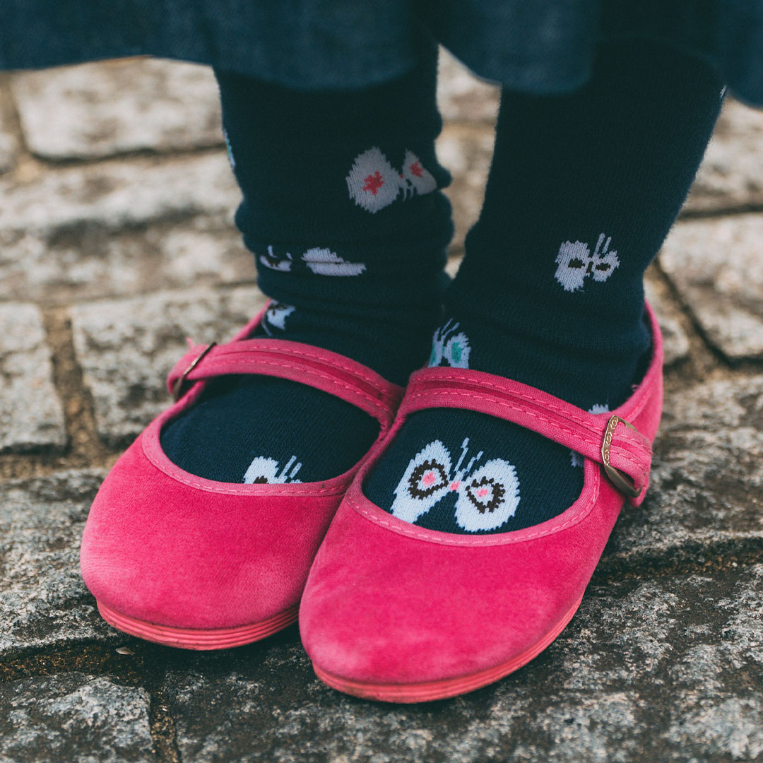 鮮やかなピンクの『ラカデナ』のベロアシューズが好アクセント! ちょうちょのモチーフ入りソックスで遊び心も忘れずに。