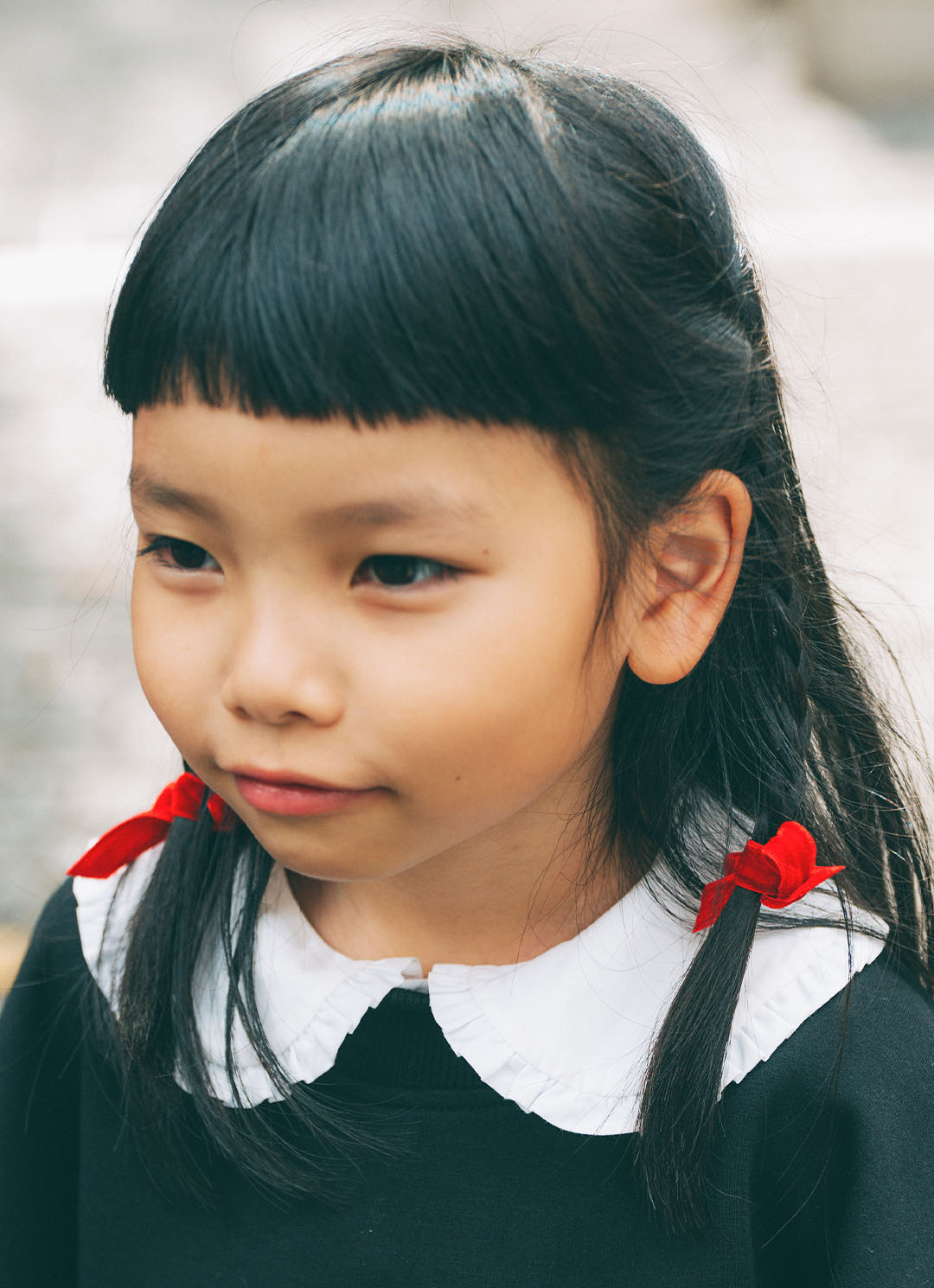 編み込みにレッドのリボンを結んで、クラシカルに昇華! 小さなアクセントで色を拾う、センスが光るスタイリング術。