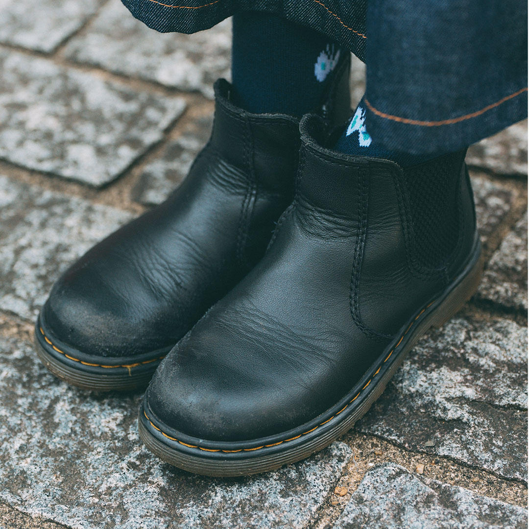 『ミナペルホネン』のソックスにブルーのモチーフをちら見せ。レザーブーツとデニムボトムスを合わせて、こなれ感のある足元の完成!
