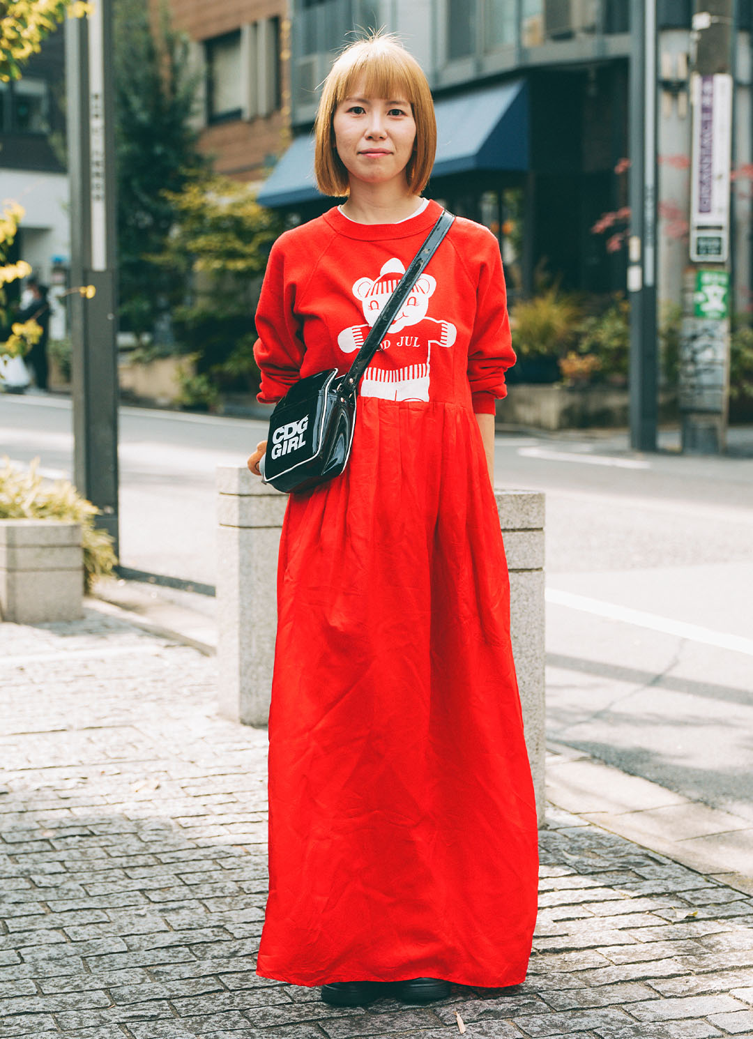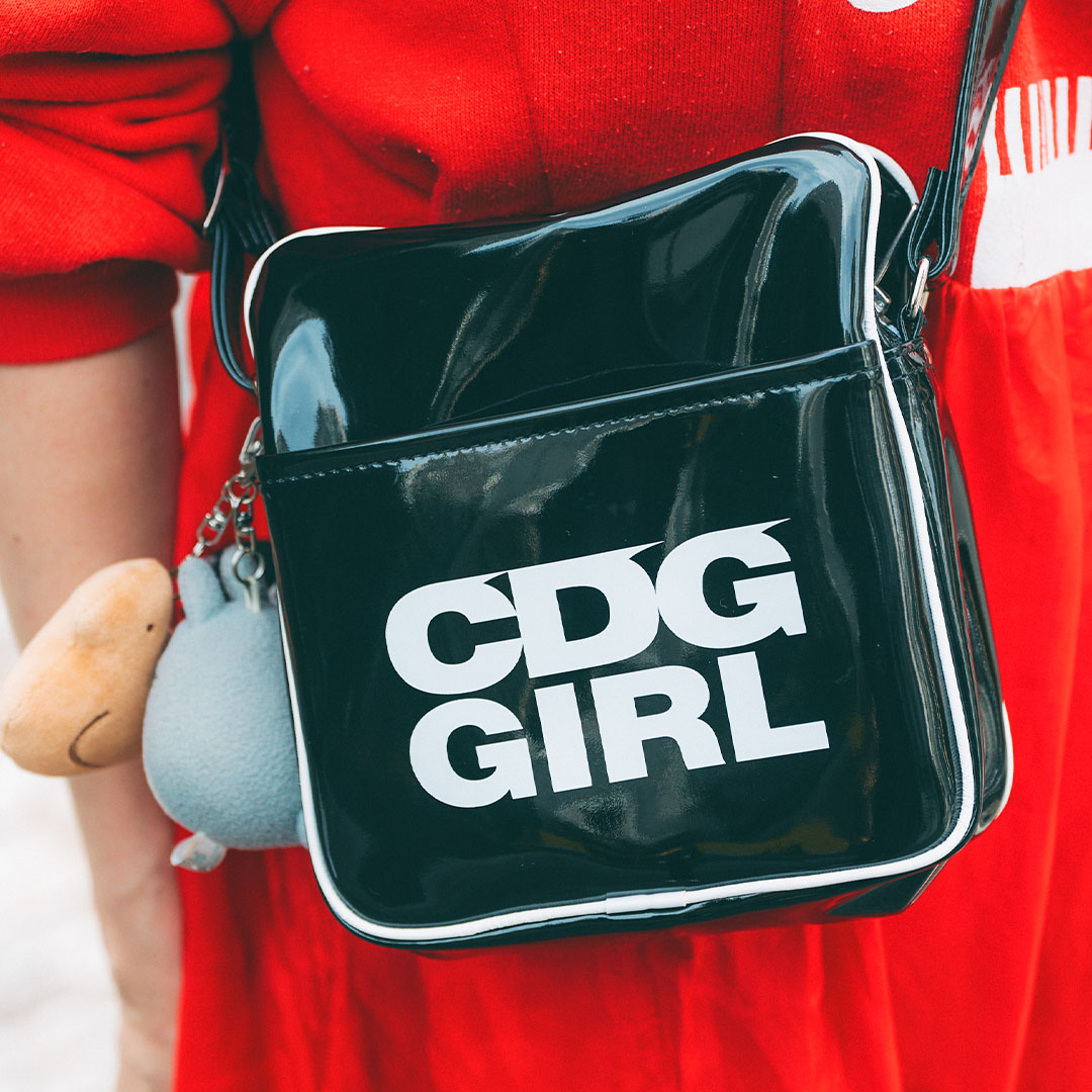 ロゴが効いてる『コムデギャルソンガール』のショルダーバッグ。つや感あるエナメル素材で、装いにスパイスをひとふり。