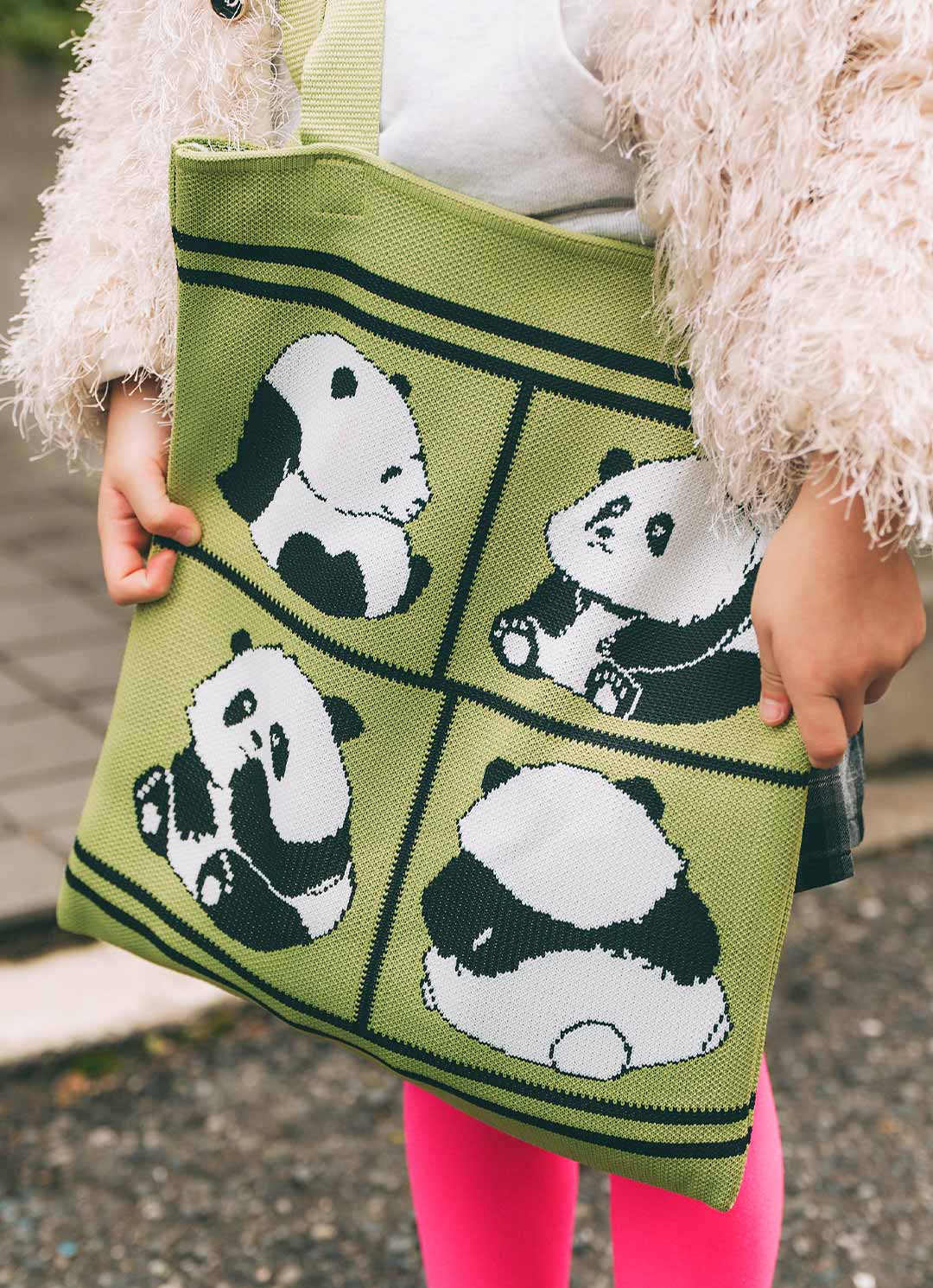 愛くるしいパンダが並ぶニットバッグは中国のお土産のもの。ほんのりしたグリーンイエローがコーデが目を引く主役級アイテム。