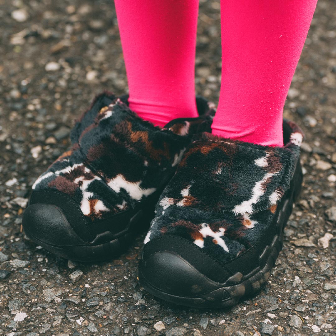 『キーン』のカウ柄のファーが冬らしさを演出! キリっとしたピンクのタイツでで重たくなるのを回避。