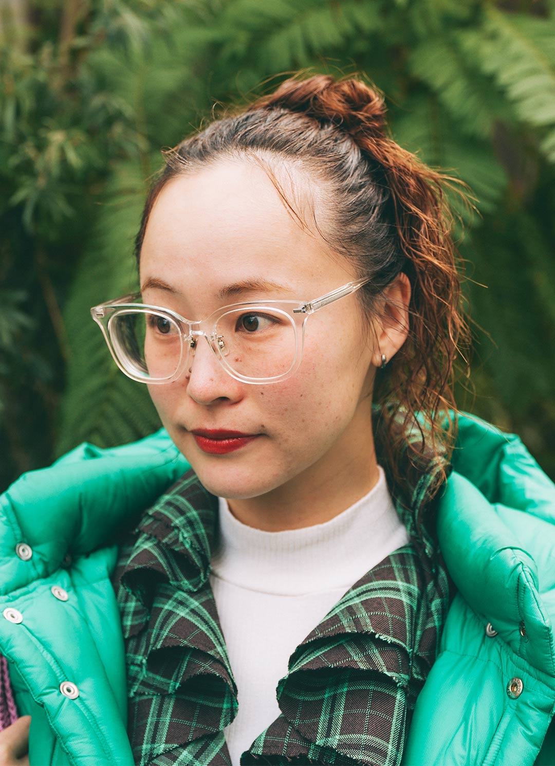 クリアフレームのメガネが、装いを軽やかにしあげてくれる。赤リップとお団子ヘアでガーリーな雰囲気漂う顔周りに昇華!