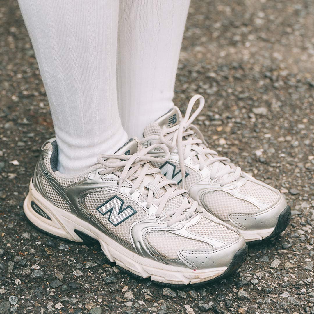 『ニューバランス』のスニーカーでスポーティーな抜け感を演出。ソックス×レースタイツのレイヤードスタイルが今どき!