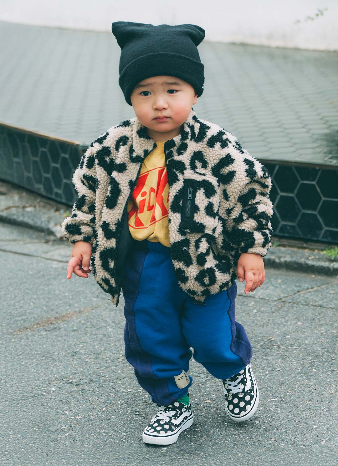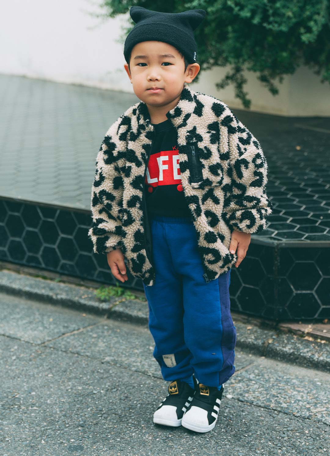 『ペアマノン』のアウターを筆頭に、お揃いを楽しんだ兄弟コーデに注目! ストリートスタイルをベースに、ヒョウ柄でスパイスを効かせたのが決め手。ママはホワイトコーデにレザージャケットや小物でエッジを付けて、モードな装いを満喫♪